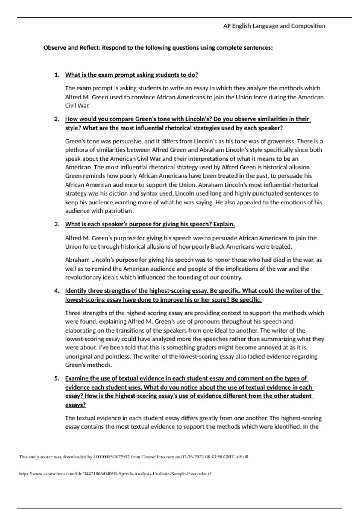 AP English Language and Composition Observe and Reflect: Respond to the following questions using complete sentences: 1. What is the exam prompt asking students to do? The exam prompt is asking students to write an essay in which they analyze the methods which Alfred M. Green used to convince African Americans to join the Union force during the American Civil War. 2. How would you compare Green's tone with Lincoln's? Do you observe similarities in their style? What are the most influential rhetorical strategies used by each speaker?