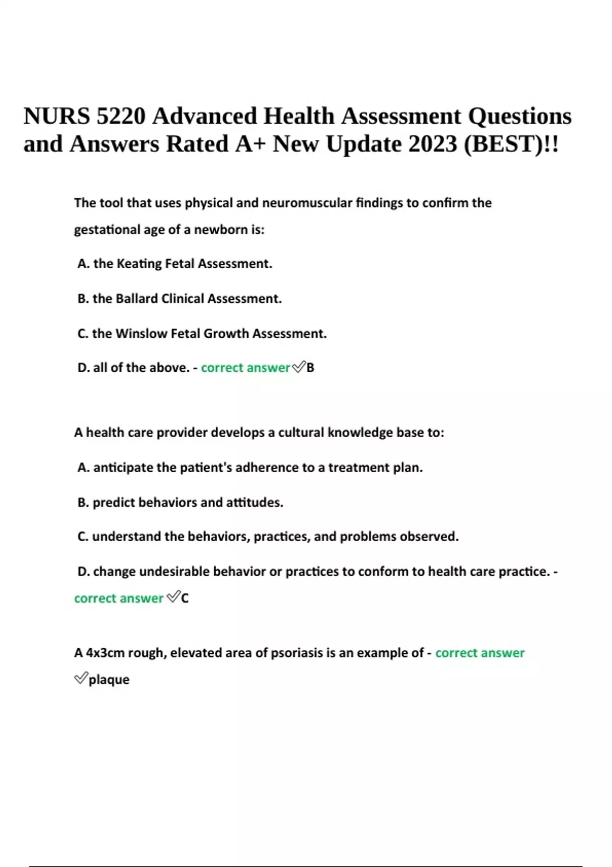NURS 5220 Advanced Health Assessment Questions and Answers Rated A+ New Update 2023 (BEST)!! The tool that uses physical and neuromuscular findings to confirm the gestational age of a newborn is: A. the Keating Fetal Assessment. B. the Ballard Clinical Assessment. C. the Winslow Fetal Growth Assessment. D. all of the above. - correct answer B A health care provider develops a cultural knowledge base to: A. anticipate the patient's adherence to a treatment plan. B. predict behaviors and attitudes. C. understand the behaviors, practices, and problems observed. D. change undesirable behavior or practices to conform to health care practice. - correct answer C A 4x3cm rough, elevated area of psoriasis is an example of - correct answer plaque NURS 5220 Advanced Health Assessment Questions and Answers Rated A+ New Update 2023 (BEST)!! In which age group are milia an expected finding? A. Newborns B. Young children C. Adolescents D. Older adults - correct answer A On palpation of an older individual's skin, you observe "tenting." Which of the following would be most appropriate for you to do in regard to this condition? A. Have the individual further evaluated for dehydration. B. Refer the client for punch biopsy of the skin. C. Inform the individual to be especially vigilant in self-screening for skin cancer. D.Observe the skin carefully for other manifestations of loss of skin integrity. - correct answer A Skin color is dependent on which of the following cells? A. Carotenocytes B. Melanocytes C. Dermatocytes D. Keratinocytes - correct answer B Wrinkling of the skin is less marked in individuals who: A. are obese. B. demonstrate premature graying. C. are white. D. have overactive sebaceous and sweat gland activity. - correct answer A Molding of the infant's head is caused by: A. premature closure of the fontanels. B. shifting and overlapping of the skull bones during birth. C. subperiosteal edema. D. increased cerebrospinal fluid. - correct answer B In addition to the head, neck, axilla, and inguinal areas, the examiner may also assess lymph nodes: A. on the palmar aspect of the hands. B. in the popliteal region. C. in the patellar region. D. on the dorsum of the foot. - correct answer B When you ask the patient to clench the teeth and then to smile, which cranial nerve are you testing? A. Trochlear B. Abducens C. Facial D. Vagus - correct answer C