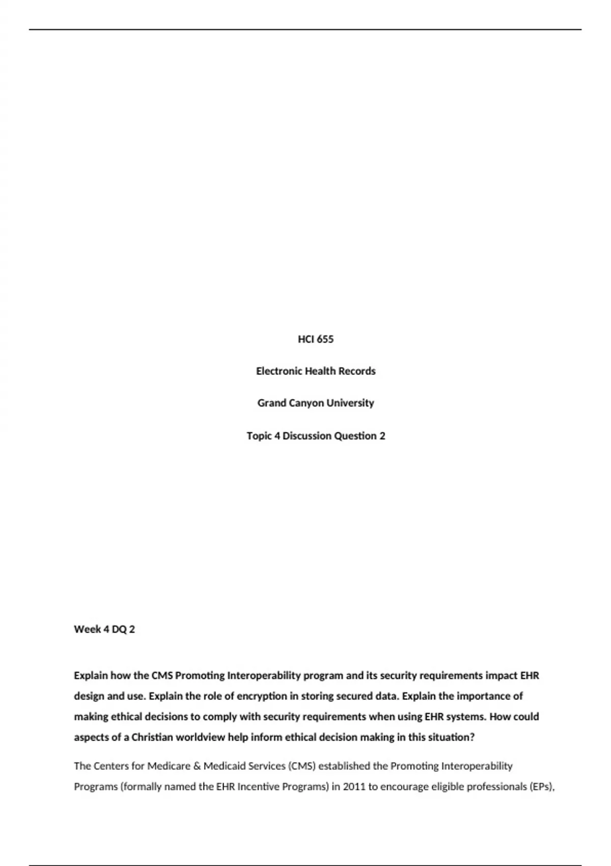HCI 655 (Electronic Health Records) Topic 4 Discussion Question 2 Description: Explain how the CMS Promoting Interoperability program and its security requirements impact EHR design and use. Explain the role of encryption in storing secured data. Explain the importance of making ethical decisions to comply with security requirements when using EHR systems. How could aspects of a Christian worldview help inform ethical decision making in this situation?