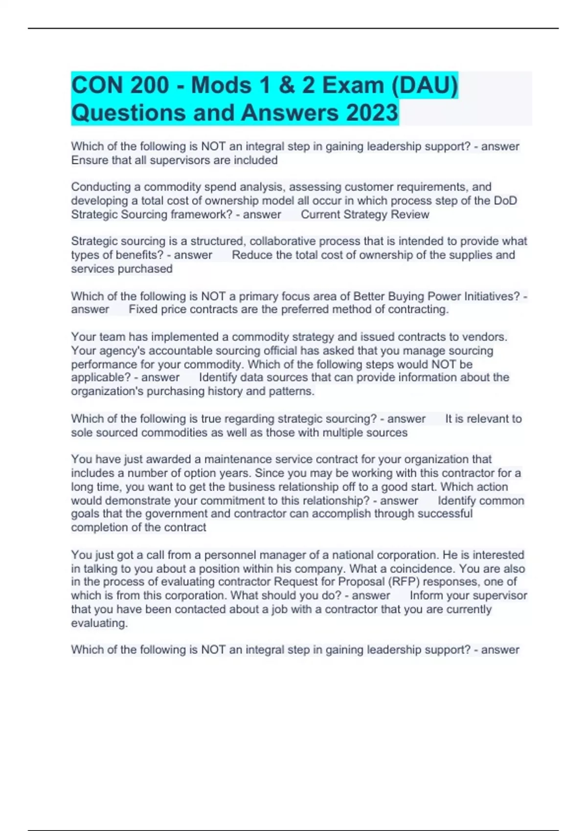 CON 200 - Mods 1 & 2 Exam (DAU) Questions and Answers 2023 Which of the following is NOT an integral step in gaining leadership support? Ensure that all supervisors are included Conducting a commodity spend analysis, assessing customer requirements, and developing a total cost of ownership model all occur in which process step of the DoD Strategic Sourcing framework? Current Strategy Review Strategic sourcing is a structured, collaborative process that is intended to provide what types of benefits? Reduce the total cost of ownership of the supplies and services purchased Which of the following is NOT a primary focus area of Better Buying Power Initiatives? Fixed price contracts are the preferred method of contracting. Your team has implemented a commodity strategy and issued contracts to vendors. Your agency's accountable sourcing official has asked that you manage sourcing performance for your commodity. Which of the following steps would NOT be applicable? Identify data sources that can provide information about the organization's purchasing history and patterns. Which of the following is true regarding strategic sourcing? It is relevant to sole sourced commodities as well as those with multiple sources You have just awarded a maintenance service contract for your organization that includes a number of option years. Since you may be working with this contractor for a long time, you want to get the business relationship off to a good start. Which action would demonstrate your commitment to this relationship? Identify common goals that the government and contractor can accomplish through successful completion of the contract You just got a call from a personnel manager of a national corporation. He is interested in talking to you about a position within his company. What a coincidence. You are also in the process of evaluating contractor Request for Proposal (RFP) responses, one of which is from this corporation. What should you do? Inform your supervisor that you have been contacted about a job with a contractor that you are currently evaluating. Which of the following is NOT an integral step in gaining leadership support?