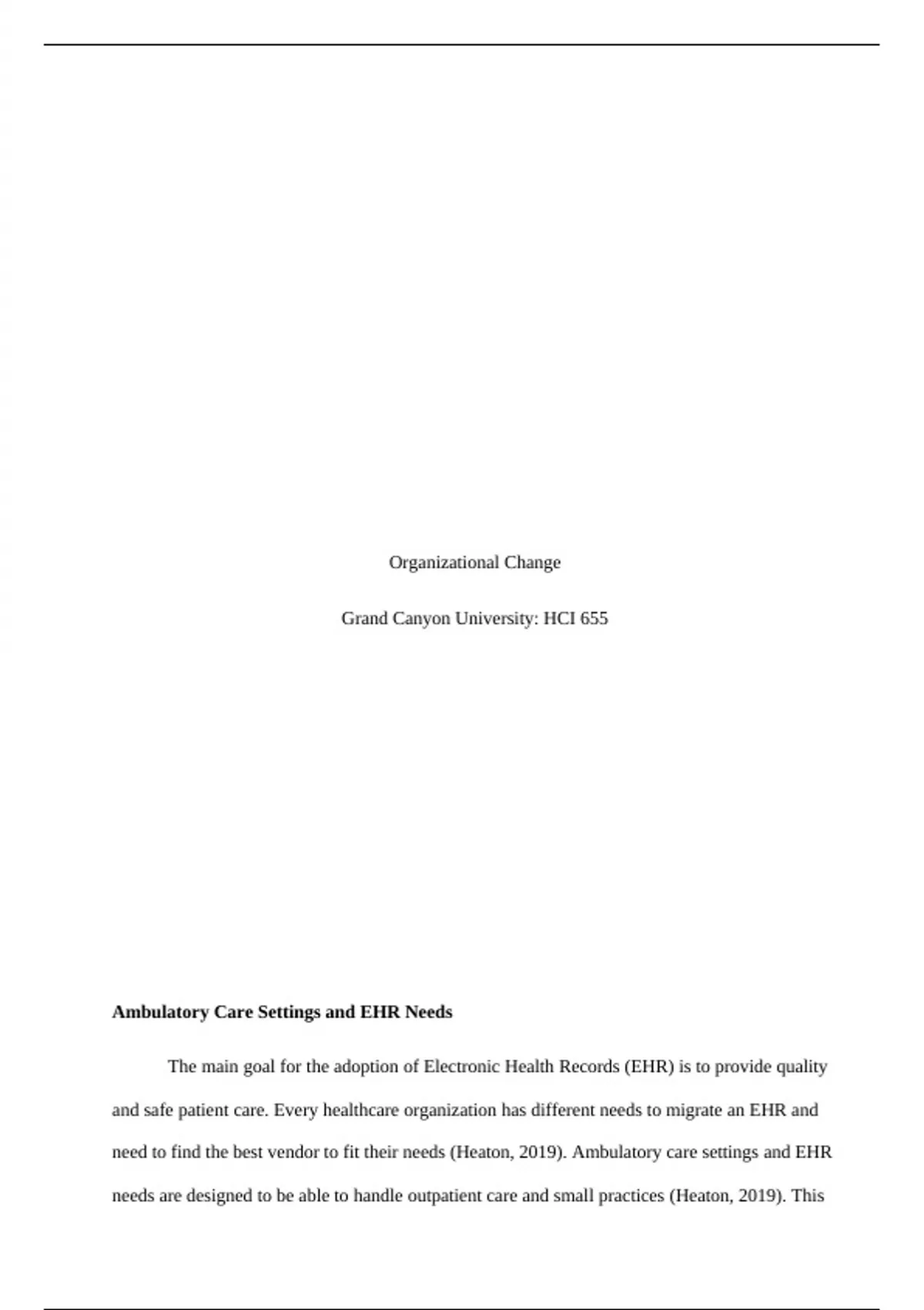 HCI 655 (Electronic Health Records) Topic 5 Assessment: Organizational Needs Description: The purpose of this assignment is to become familiar with how organizational needs influence the selection of EHRs. In a 500-750 word essay, reflect on how an organization's needs are supported by an EHR vendor. Choose a health care setting and a related organization. Identify the specific needs that influence the selection of an EHR for that organization. Include the following: 1. Describe the organizational needs for the organization you selected. 2. Explain how EHR vendors can support the organization by considering its organizational needs. 3. Explain how organizational needs are used to establish user specifications. 4. Describe the types of clinical content offered by EHR vendors. 5. Explain the importance of pre-authored clinical content provided by EHR vendors.