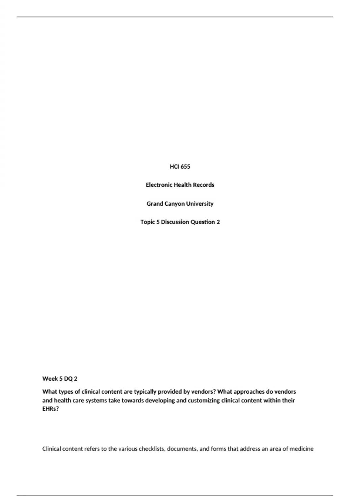 HCI 655 (Electronic Health Records) Topic 5 Discussion Question 2 Description: What types of clinical content are typically provided by vendors? What approaches do vendors and health care systems take towards developing and customizing clinical content within their EHRs?