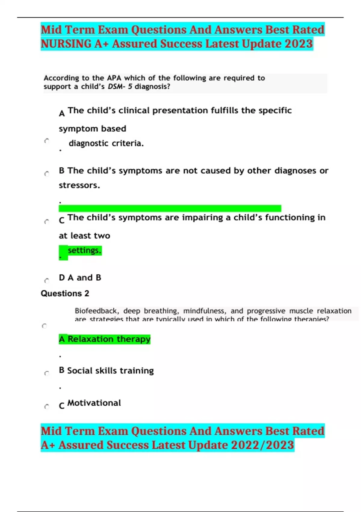 Mid Term Exam Questions And Answers Best Rated NURSING A+ Assured Success Latest Update 2023