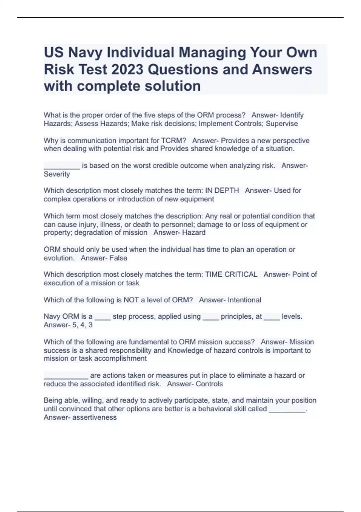 US Navy Individual Managing Your Own Risk Test 2023 Questions and Answers with complete solution