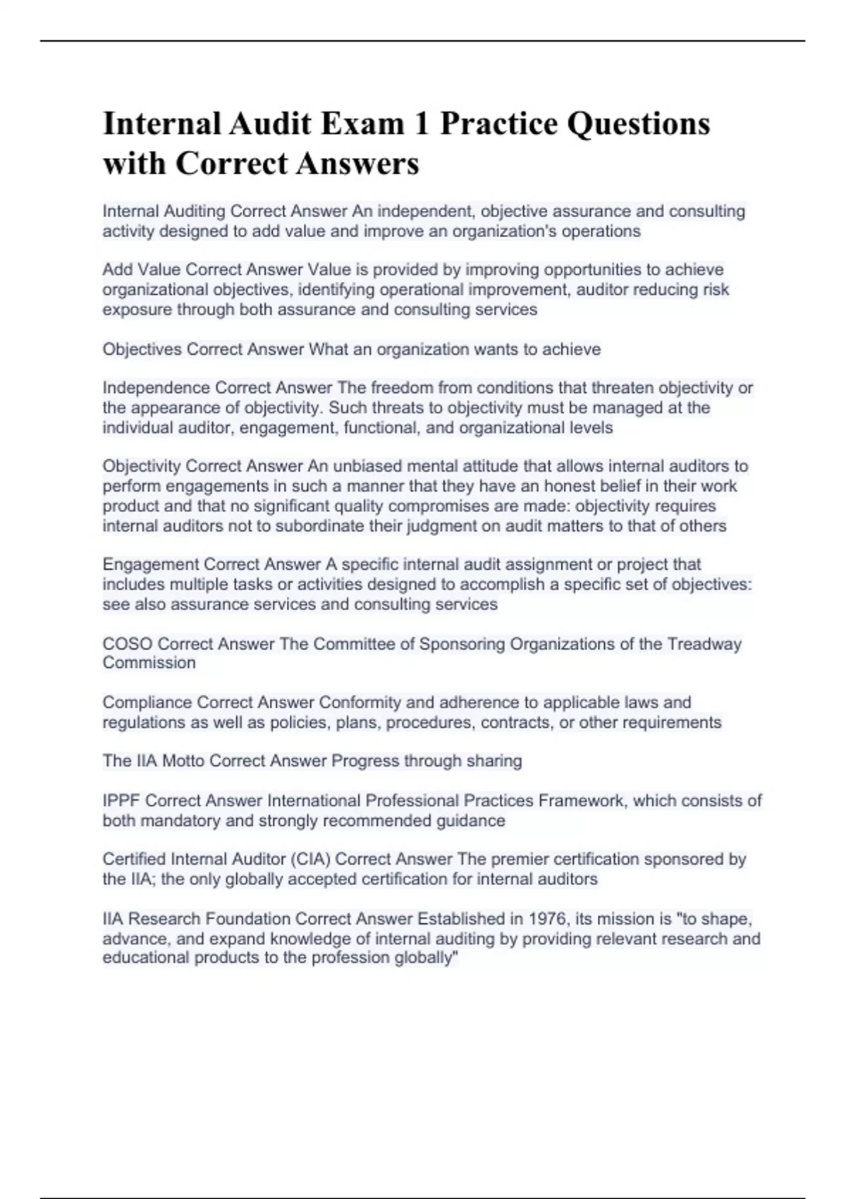 Internal Audit Exam 1 Practice Questions with Correct Answers