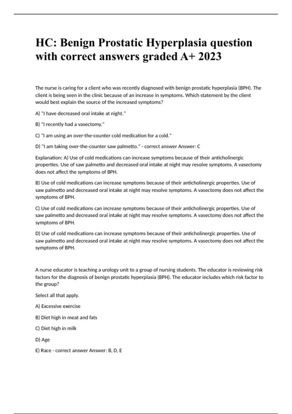 HC: Benign Prostatic Hyperplasia question with correct answers graded A+ 2023The nurse is caring for a client who was recently diagnosed with benign prostatic hyperplasia (BPH). The client is being seen in the clinic because of an increase in symptoms. Which statement by the client would best explain the source of the increased symptoms? A) "I have decreased oral intake at night." B) "I recently had a vasectomy." C) "I am using an over-the-counter cold medication for a cold." D) "I am taking over-the-counter saw palmetto." - correct answer Answer: C Explanation: A) Use of cold medications can increase symptoms because of their anticholinergic properties. Use of saw palmetto and decreased oral intake at night may resolve symptoms. A vasectomy does not affect the symptoms of BPH. B) Use of cold medications can increase symptoms because of their anticholinergic properties. Use of saw palmetto and decreased oral intake at night may resolve symptoms. A vasectomy does not affect the symptoms of BPH. C) Use of cold medications can increase symptoms because of their anticholinergic properties. Use of saw palmetto and decreased oral intake at night may resolve symptoms. A vasectomy does not affect the symptoms of BPH. D) Use of cold medications can increase symptoms because of their anticholinergic properties. Use of saw palmetto and decreased oral intake at night may resolve symptoms. A vasectomy does not affect the symptoms of BPH. A nurse educator is teaching a urology unit to a group of nursing students. The educator is reviewing risk factors for the diagnosis of benign prostatic hyperplasia (BPH). The educator includes which risk factor to the group? Select all that apply. A) Excessive exercise B) Diet high in meat and fats C) Diet high in milk D) Age E) Race - correct answer Answer: B, D, E