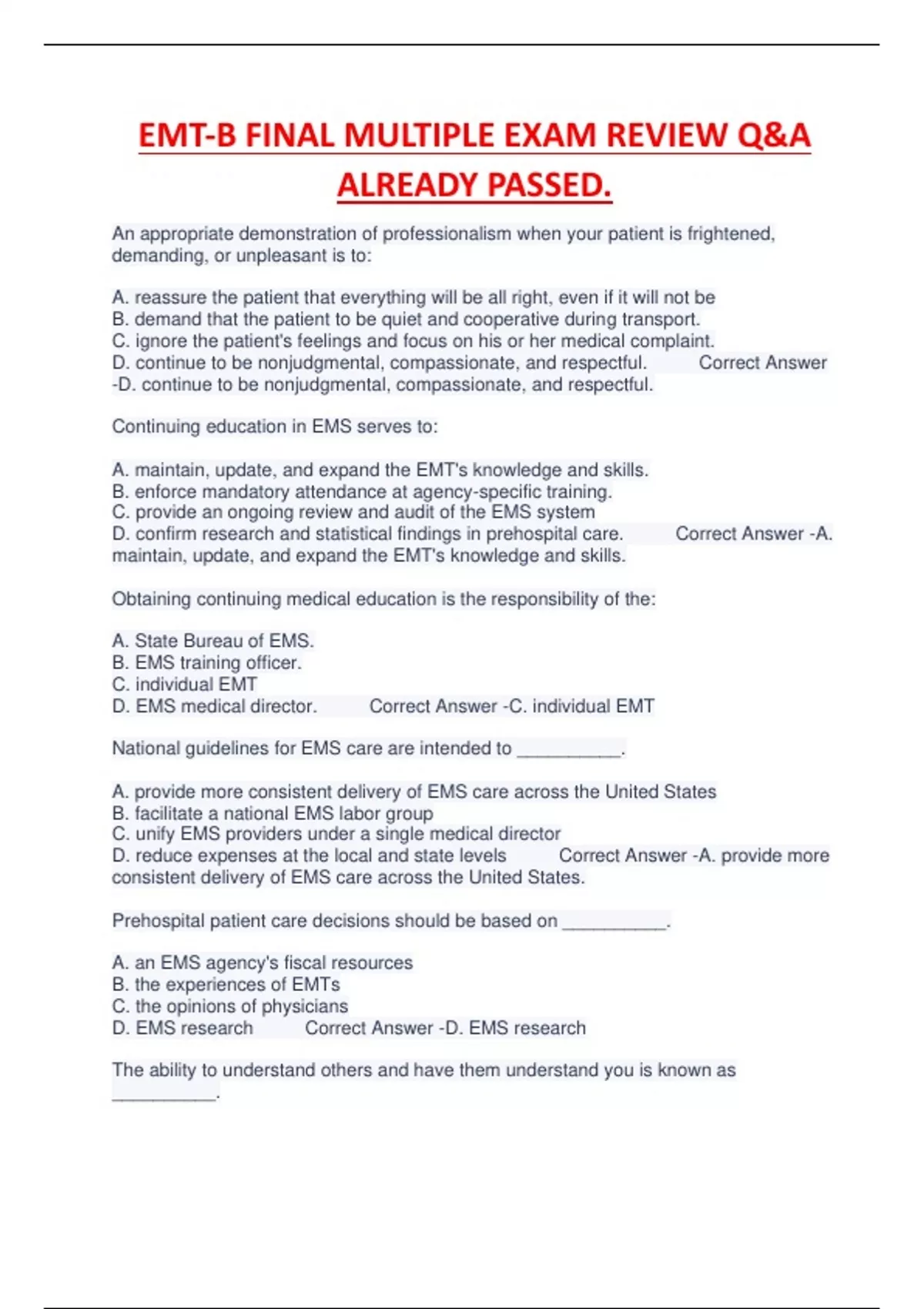 EMT-B FINAL MULTIPLE EXAM REVIEW Q&A ALREADY PASSED.EMT-B FINAL MULTIPLE EXAM REVIEW Q&A ALREADY PASSED.EMT-B FINAL MULTIPLE EXAM REVIEW Q&A ALREADY PASSED.EMT-B FINAL MULTIPLE EXAM REVIEW Q&A ALREADY PASSED.EMT-B FINAL MULTIPLE EXAM REVIEW Q&A ALREADY PASSED.EMT-B FINAL MULTIPLE EXAM REVIEW Q&A ALREADY PASSED.EMT-B FINAL MULTIPLE EXAM REVIEW Q&A ALREADY PASSED.EMT-B FINAL MULTIPLE EXAM REVIEW Q&A ALREADY PASSED.