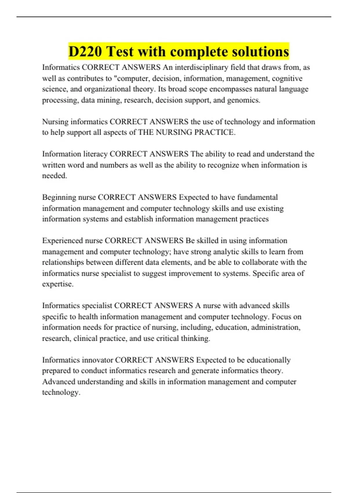 D220 Test with complete solutions Informatics. Nursing informatics. Information literacy Beginning nurse Experienced nurse Informatics specialist. Informatics innovator Evidence based practice (EBP) The American Recovery and Reinvestment act (ARRA) Health Information Technology for Economic and Clinical Health (HITECH) Joint Commission TIGER Information system. Clinical Decision Support Expert system Alert fatigue Admission, transfer, discharge system The relationship of standardized terms to financial reward r/t meaningful use The goal of meaningful use Classification system reference terminology SNOWMED-CT "EPIC-to-Cemer"