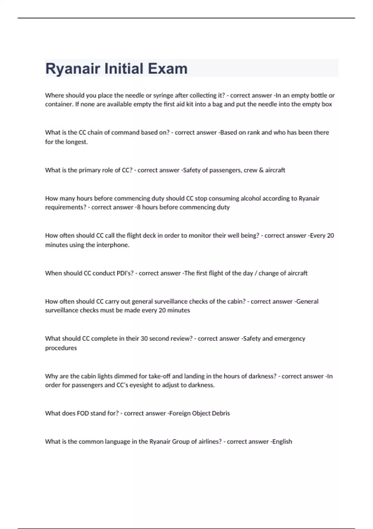 Where should you place the needle or syringe after collecting it? In an empty bottle or container. If none are available empty the first aid kit into a bag and put the needle into the empty box What is the CC chain of command based on? Based on rank and who has been there for the longest. What is the primary role of CC? Safety of passengers, crew & aircraft How many hours before commencing duty should CC stop consuming alcohol according to Ryanair requirements? 8 hours before commencing duty How often should CC call the flight deck in order to monitor their well being? Every 20 minutes using the interphone. When should CC conduct PDI's? The first flight of the day / change of aircraft How often should CC carry out general surveillance checks of the cabin? General surveillance checks must be made every 20 minutes What should CC complete in their 30 second review? Safety and emergency procedures Why are the cabin lights dimmed for take-off and landing in the hours of darkness? In order for passengers and CC's eyesight to adjust to darkness. What does FOD stand for? Foreign Object Debris What is the common language in the Ryanair Group of airlines? English