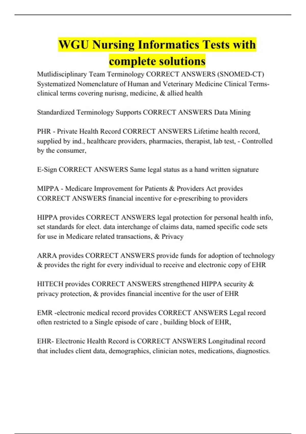WGU Nursing Informatics Tests with complete solutions Mutlidisciplinary Team Terminology Standardized Terminology Supports PHR - Private Health Record E-Sign MIPPA - Medicare Improvement for Patients & Providers Act provides HIPPA provides ARRA provides HITECH provides EMR -electronic medical record provides EHR- Electronic Health Record is Affordable Care Act provides Data is Information is oc Knowledge is Computer Technology is HIS HEalthcare Information System is Clinical Systems include: order entry, radiology, pharmacy, physician management system , Administrative System includes these functions Hippa - Compliant Codes inlcude