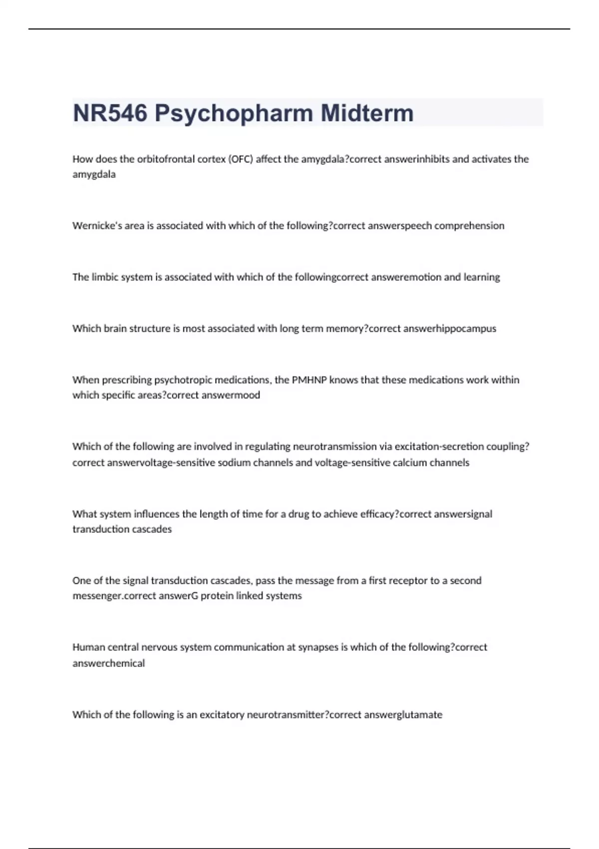 How does the orbitofrontal cortex (OFC) affect the amygdala? inhibits and activates the amygdala Wernicke's area is associated with which of the following? speech comprehension The limbic system is associated with which of the following emotion and learning Which brain structure is most associated with long term memory? hippocampus When prescribing psychotropic medications, the PMHNP knows that these medications work within which specific areas? mood Which of the following are involved in regulating neurotransmission via excitation-secretion coupling? voltage-sensitive sodium channels and voltage-sensitive calcium channels What system influences the length of time for a drug to achieve efficacy? signal transduction cascades One of the signal transduction cascades, pass the message from a first receptor to a second messenger. G protein linked systems Human central nervous system communication at synapses is which of the following? chemical Which of the following is an excitatory neurotransmitter? glutamate Which statement correctly pairs the pharmacodynamic effect with its definition? antagonist effect - drug binds to receptor, but does not activate a response A major current hypothesis for the cause of schizophrenia proposes that N-methyl-d-aspartate (NMDA) receptors may be which of the following? Correct! hypofunctional Which medication is least associated with weight gain? aripiprazole Which dopamine pathway is associated with positive symptoms of schizophrenia? mesolimbic pathway Which pathway is associated with negative symptoms? The mesocortical pathway Is part of the extrapyramidal nervous system and associated with extrapyramidal symptoms (EPS) nigrostriatal pathway This pathway is associated with hyperprolactinemia. The tuberoinfundibular pathway A 34-year old male recently began experiencing breast secretions while receiving risperidone . Which dopamine pathway is associated with this side effect? tuberoinfundibular pathway A 44-year-old woman is initiated on an atypical antipsychotic for the treatment of schizophrenia. Regarding affinity, atypical antipsychotics demonstrate which of the following most often? Atypical antipsychotics have equal positive symptom antipsychotic actions and low extrapyramidal symptoms. is a syndrome that can be associated with several different psychiatric disorders. Symptoms include hallucinations, delusions, disorganized speech, disorganized behavior, and distortions of reality. This syndrome can affect a person's cognition, affective response, communication, capacity to recognize reality, and ability to relate to others. psychosis What Diagnosis require the presence of psychosis? schizophrenia substance-induced psychotic disorders schizophreniform disorder schizoaffecive disorder delusional disorder brief psychotic disorder psychotic disorder due to a medical condition What diagnosis has a diagnosis of psychosis as a feature? mania depression cognitive disorders dementia What are some positive symptoms? Hallucinations Delusions Thought disorder Hostility Excitability What are some Negative symptoms? Affective flattening Alogia Anhedonia Amotivation Asociality What area of the brain is associated with negative and affective symptoms? Mesocortical and ventromedial prefrontal cortex: What area of the brain is associated with cognitive symptoms? Dorsolateral What area of the brain is associated with aggressive, impulsive symptoms? Orbitofrontal and connections to the amygdala Non-selectively blocks dopamine D2 receptors, specifically in mesolimbic pathway. Improves Positive Symptoms Use: Acute & Chronic Schizophrenia & Psychosis First generation antipsychotics are associated with movement, intelligence, abstract thinking, the ability to organize, personality, behavior, and emotional control. Traumatic brain injuries can result in personality changes, difficulty controlling emotions, and other cognitive functions Frontal Lobes responsible for proprioception, is the home of the somatic senses. This part of the brain helps a person to identify spatial relationships, interpret pain and touch in the body, and identify and give meaning to objects Parietal Lobe (Middle Brain) Damage to the anterior portion may cause asterogenesis, the loss of ability to recognize objects via the sense of touch. This may be experienced by patients with post cerebral vascular accidents parietal Lobe and involved in short-term memory, speech, auditory signals, and smell recognition. It identifies "what" things are - object identification. It contains the limbic system, amygdala, and hippocampus. Temporal Lobe Disorders from this lobe include dementia, affective disorders, and attention deficit hyperactivity disorders (ADHD). Temporal Lobe controls visual processing. Damage to this lobe results in the inability to form visual memories. Bilateral lobe damage results in the inability to recognize items by sight even though vision is normal. Occipital Lobe This separates the frontal lobe from the parietal lobe. Central sulcus This controls the communication between the two brain hemispheres. Is involved in attention, impulse control, and emotion regulation. It integrates impulses from both sides of the brain. corpus callosum This is located deep in the temporal lobes and is involved in anxiety and memory, and shifting short-term to long-term memory. Hippocampus This is located deep in the temporal lobes and involved in emotional regulation and perception of odors. All smells travel directly to this structure. Cooking smells can elicit memories of childhood events and holidays. A traumatic event can result in the formation of the fear response, causing the fight or flight reflex within the autonomic nervous system and affects the hypothalamic-pituitary-adrenal (HPA) axis causing the release of stress hormones Amygdala This is an egg-shaped structure involved in sensory organ and motor command processing. All sensory systems except for the olfaction process through the thalamus, whic