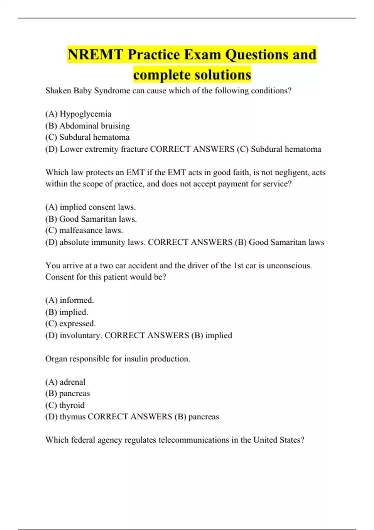 NREMT Practice Exam Questions and complete solutions Shaken Baby Syndrome can cause which of the following conditions? Which law protects an EMT if the EMT acts in good faith, is not negligent, acts within the scope of practice, and does not accept payment for service? You arrive at a two car accident and the driver of the 1st car is unconscious. Consent for this patient would be? Organ responsible for insulin production. Which federal agency regulates telecommunications in the United States? . What is the rate of chest compressions for a two-year-old in cardiac arrest? A BVM with a reservoir and oxygen source (at least 15 LPM) delivers an oxygen concentration of Beck's triad (associated with pericardial tamponade) includes: distant heart tones, JVD, and... ( What happens during inspiration?
