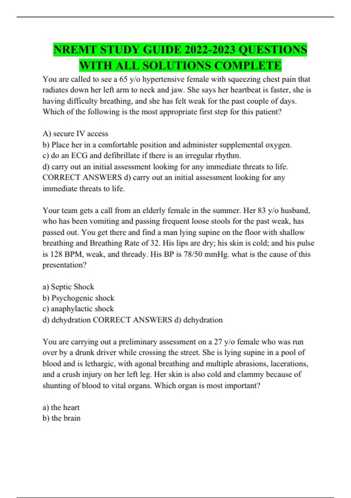 NREMT STUDY GUIDE QUESTIONS WITH ALL SOLUTIONS COMPLETE You are called to see a 65 y/o hypertensive female with squeezing chest pain that radiates down her left arm to neck and jaw. She says her heartbeat is faster, she is having difficulty breathing, and she has felt weak for the past couple of days. Which of the following is the most appropriate first step for this patient? Your team gets a call from an elderly female in the summer. Her 83 y/o husband, who has been vomiting and passing frequent loose stools for the past weak, has passed out. You get there and find a man lying supine on the floor with shallow breathing and Breathing Rate of 32. His lips are dry; his skin is cold; and his pulse is 128 BPM, weak, and thready. His BP is 78/50 mmHg. what is the cause of this presentation? You are carrying out a preliminary assessment on a 27 y/o female who was run over by a drunk driver while crossing the street. She is lying supine in a pool of blood and is lethargic, with agonal breathing and multiple abrasions, lacerations, and a crush injury on her left leg. Her skin is also cold and clammy because of shunting of blood to vital organs. Which organ is most important? A 22 y/o pregnant female in her first trimester starts bleeding profusely from her vagina after spotting for the past 2 days. On arrival at her home, she is conscious, cold but weak, with a HR of 132 BPM, RR of 28, and a BP 92/60 mmHg. Which of the following actions is most appropriate? You are called by neighbors to attend to a middle-aged diabetic man who was robbed at home and pushed down a flight of stairs by his assailant. You find him lying at the foot of the stairs, conscious but complaining of a headache where he hit his head. His skin is warm, and his breathing is labored with a Pulse of 40 and