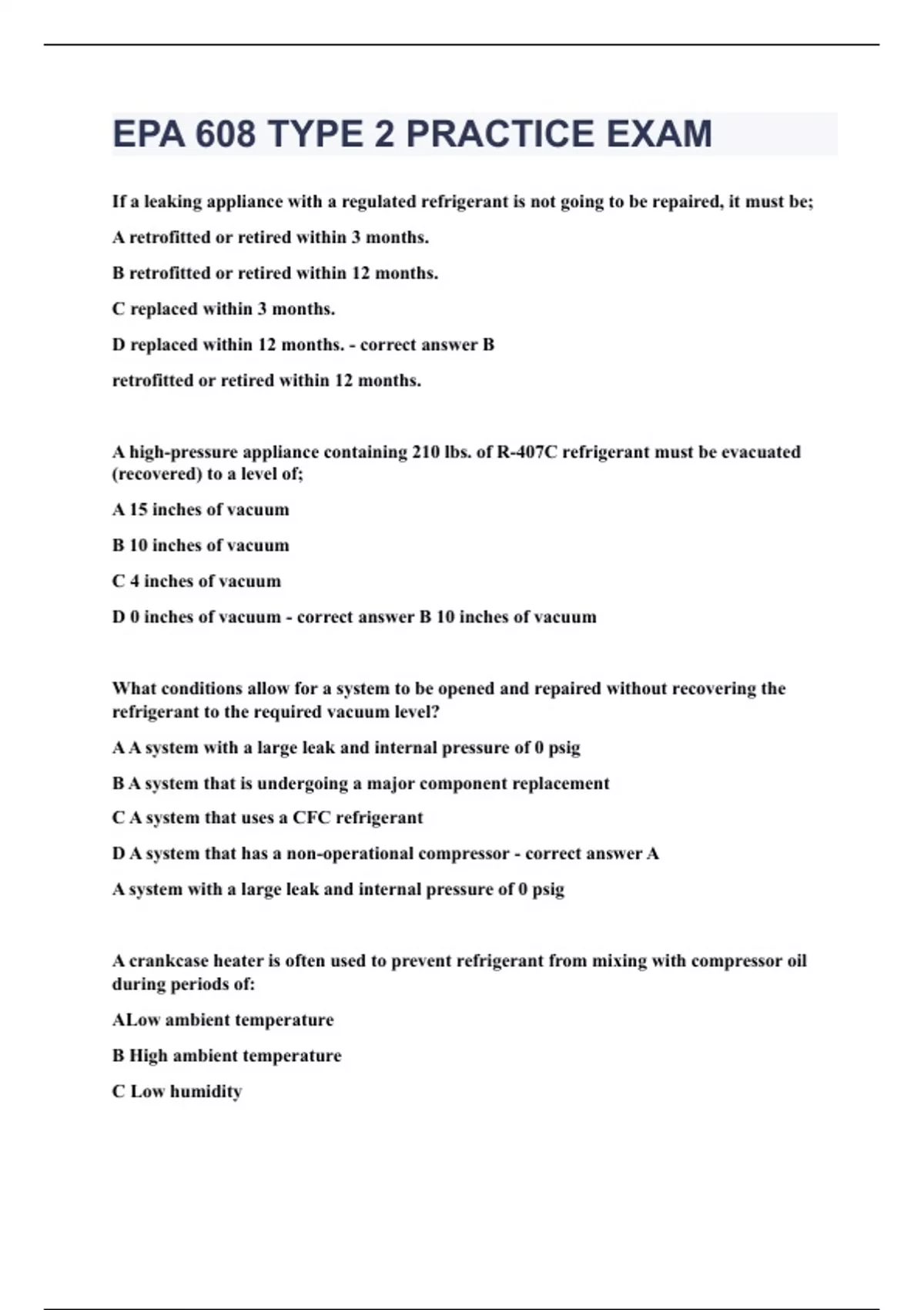 If a leaking appliance with a regulated refrigerant is not going to be repaired, it must be; A retrofitted or retired within 3 months. B retrofitted or retired within 12 months. C replaced within 3 months. D replaced within 12 months. B retrofitted or retired within 12 months. A high-pressure appliance containing 210 lbs. of R-407C refrigerant must be evacuated (recovered) to a level of; A 15 inches of vacuum B 10 inches of vacuum C 4 inches of vacuum D 0 inches of vacuum B 10 inches of vacuum Must See! Eyewitness Captures the Moment a Pair of Male Sea Lions Attack Beach-Goers What conditions allow for a system to be opened and repaired without recovering the refrigerant to the required vacuum level? A A system with a large leak and internal pressure of 0 psig B A system that is undergoing a major component replacement C A system that uses a CFC refrigerant D A system that has a non-operational compressor A A system with a large leak and internal pressure of 0 psig A crankcase heater is often used to prevent refrigerant from mixing with compressor oil during periods of: ALow ambient temperature B High ambient temperature C Low humidity D High humidity A Low ambient temperature Leaks must be repaired on industrial process and refrigeration units with a 50-pound charge or greater when the annualized leak rate reaches _____ or more. A 10% B 20% C 30% D 40% C 30% When dehydrating a system, it should be evacuated to a minimum level of; A 30 inches of Mercury B 25,000 Microns C 500 Microns D EPA does not have a requirement C 500 Microns All HVAC/R systems must be protected by a; A Low-pressure switch B High-pressure switch C Compressor impedance overload D Pressure relief valve D Pressure relief valve Proper recovery techniques begin with the use of appropriate recovery equipment that has been certified by; A EPA only B Manufacturers approved by UL C EPA approved laboratory D EPA field supervisors C EPA approved laboratory Refrigerants CFC-12, HCFC-22, and HFC-134a are all classified as Type _______ substances. A B-1 B B-2 C A-1 D A-2 A-1