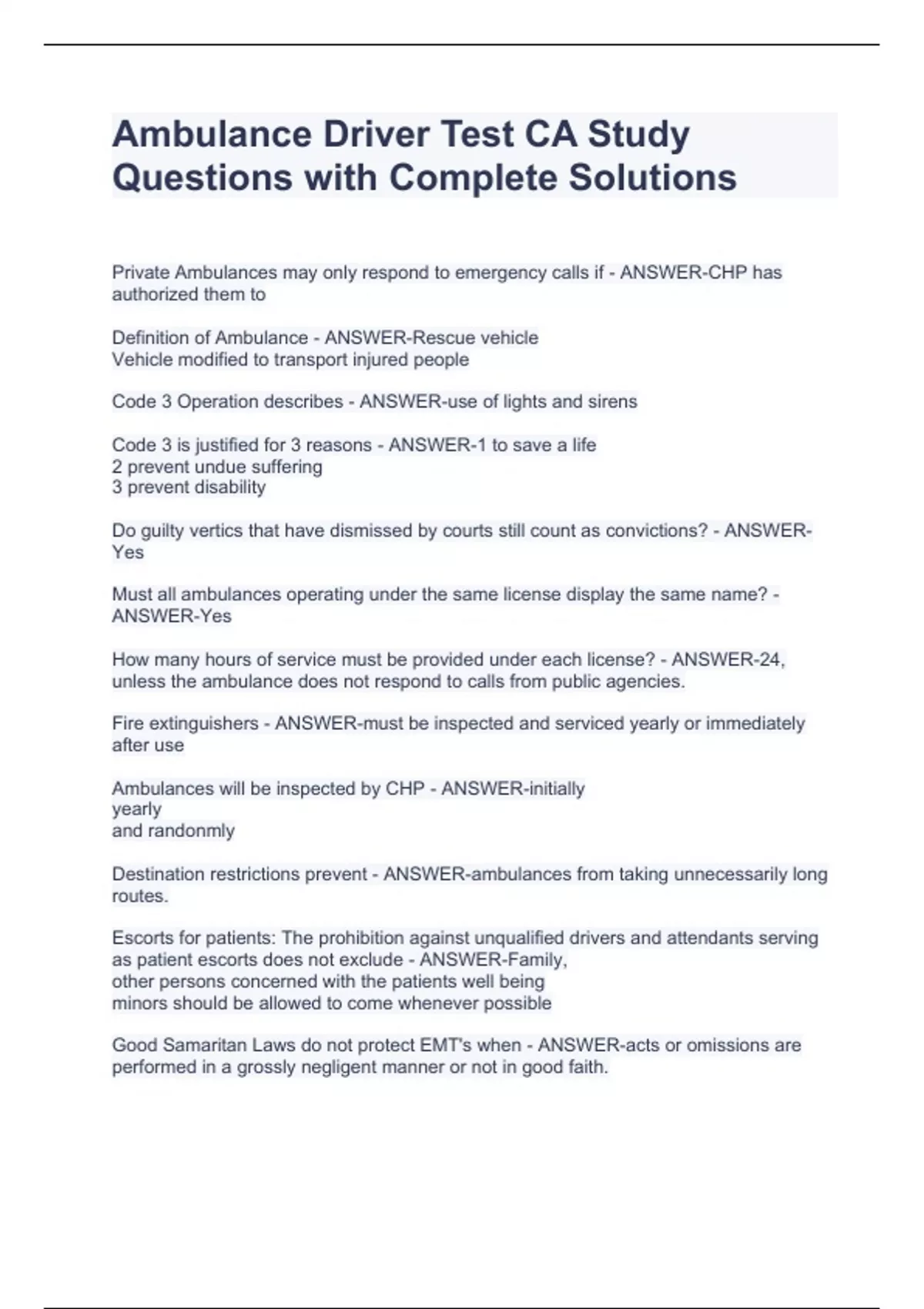 Ambulance Driver Test CA Study Questions with Complete SolutionsAmbulance Driver Test CA Study Questions with Complete SolutionsAmbulance Driver Test CA Study Questions with Complete SolutionsAmbulance Driver Test CA Study Questions with Complete Solutions Private Ambulances may only respond to emergency calls if - ANSWER-CHP has authorized them to Definition of Ambulance - ANSWER-Rescue vehicle Vehicle modified to transport injured people Code 3 Operation describes - ANSWER-use of lights and sirens Code 3 is justified for 3 reasons - ANSWER-1 to save a life 2 prevent undue suffering 3 prevent disability Do guilty vertics that have dismissed by courts still count as convictions? - ANSWER-Yes Must all ambulances operating under the same license display the same name? - ANSWER-Yes How many hours of service must be provided under each license? - ANSWER-24, unless the ambulance does not respond to calls from public agencies. Fire extinguishers - ANSWER-must be inspected and serviced yearly or immediately after use Ambulances will be inspected by CHP - ANSWER-initially yearly and randonmly
