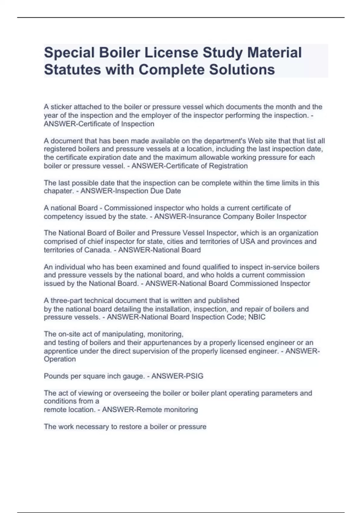 Special Boiler License Study Material Statutes with Complete SolutionsSpecial Boiler License Study Material Statutes with Complete SolutionsSpecial Boiler License Study Material Statutes with Complete Solutions A sticker attached to the boiler or pressure vessel which documents the month and the year of the inspection and the employer of the inspector performing the inspection. - ANSWER-Certificate of Inspection A document that has been made available on the department's Web site that that list all registered boilers and pressure vessels at a location, including the last inspection date, the certificate expiration date and the maximum allowable working pressure for each boiler or pressure vessel. - ANSWER-Certificate of Registration The last possible date that the inspection can be complete within the time limits in this chapater. - ANSWER-Inspection Due Date A national Board - Commissioned inspector who holds a current certificate of competency issued by the state. - ANSWER-Insurance Company Boiler Inspector The National Board of Boiler and Pressure Vessel Inspector, which is an organization comprised of chief inspector for state, cities and territories of USA and provinces and territories of Canada. - ANSWER-National Board An individual who has been examined and found qualified to inspect in-service boilers and pressure vessels by the national board, and who holds a current commission