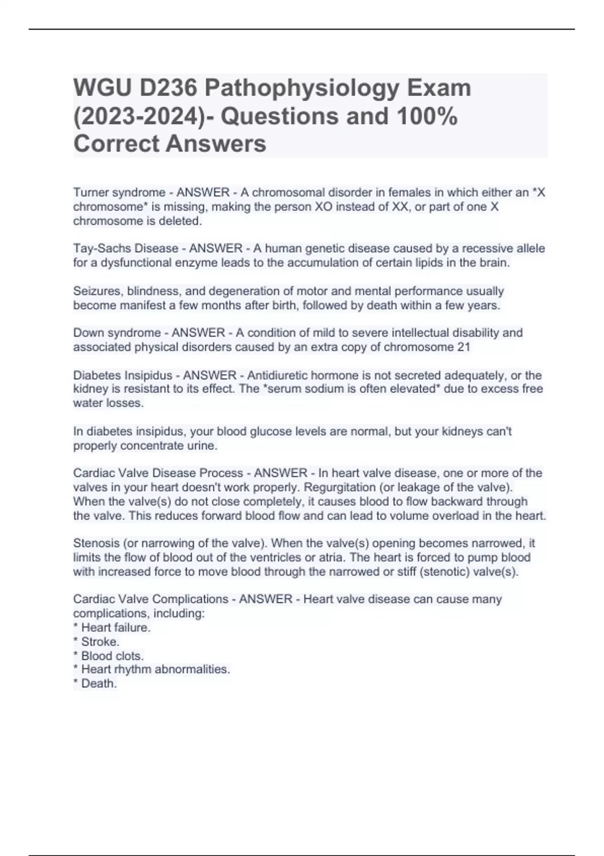 WGU D236 Pathophysiology Exam ()- Questions and 100% Correct AnswersWGU D236 Pathophysiology Exam ()- Questions and 100% Correct AnswersWGU D236 Pathophysiology Exam ()- Questions and 100% Correct Answers Turner syndrome - ANSWER - A chromosomal disorder in females in which either an *X chromosome* is missing, making the person XO instead of XX, or part of one X chromosome is deleted. Tay-Sachs Disease - ANSWER - A human genetic disease caused by a recessive allele for a dysfunctional enzyme leads to the accumulation of certain lipids in the brain. Seizures, blindness, and degeneration of motor and mental performance usually become manifest a few months after birth, followed by death within a few years. Down syndrome - ANSWER - A condition of mild to severe intellectual disability and associated physical disorders caused by an extra copy of chromosome 21 Diabetes Insipidus - ANSWER - Antidiuretic hormone is not secreted adequately, or the kidney is resistant to its effect. The *serum sodium is often elevated* due to excess free water losses. In diabetes insipidus, your blood glucose levels are normal, but your kidneys can't properly concentrate urine. Cardiac Valve Disease Process - ANSWER - In heart valve disease, one or more of the valves in your heart doesn't work properly. Regurgitation (or leakage of the valve). When the valve(s) do not close completely, it causes blood to flow backward through the valve. This reduces forward blood flow and can lead to volume overload in the heart. Stenosis (or narrowing of the valve). When the valve(s) opening becomes narrowed, it