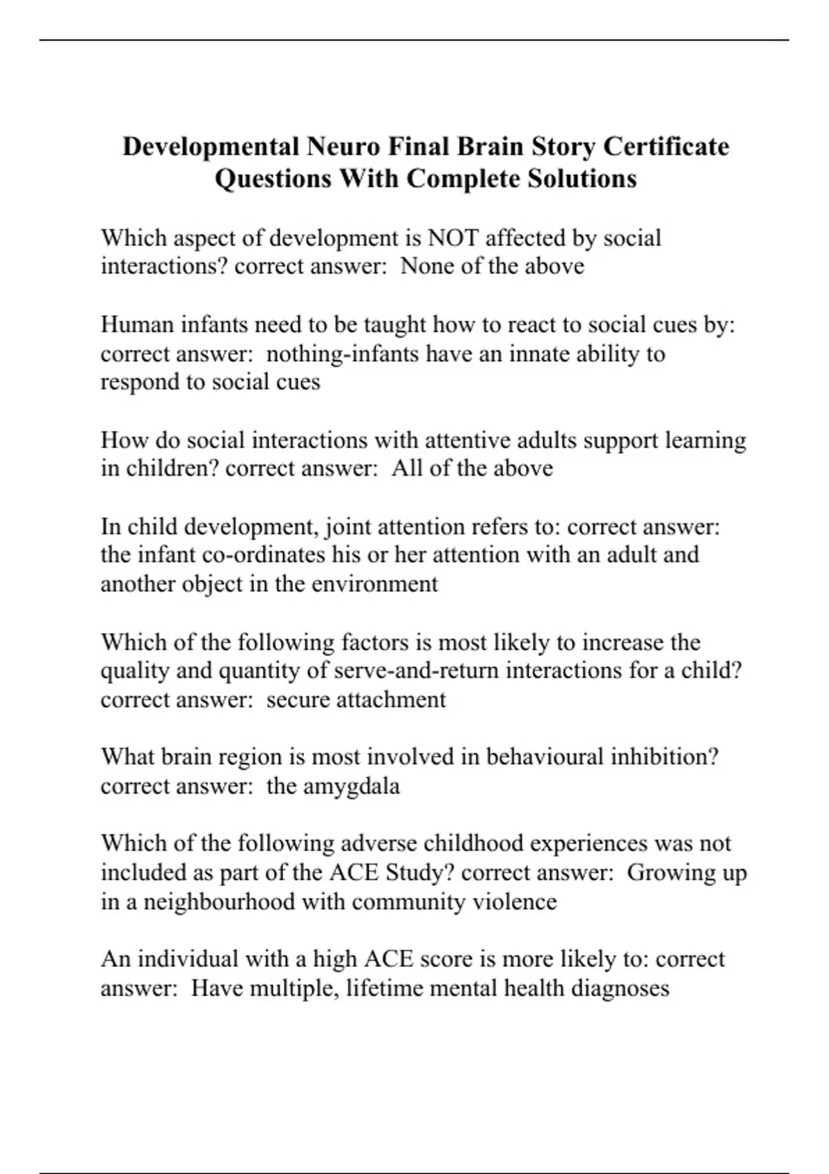 Developmental Neuro Final Brain Story Certificate Questions With Complete Solutions