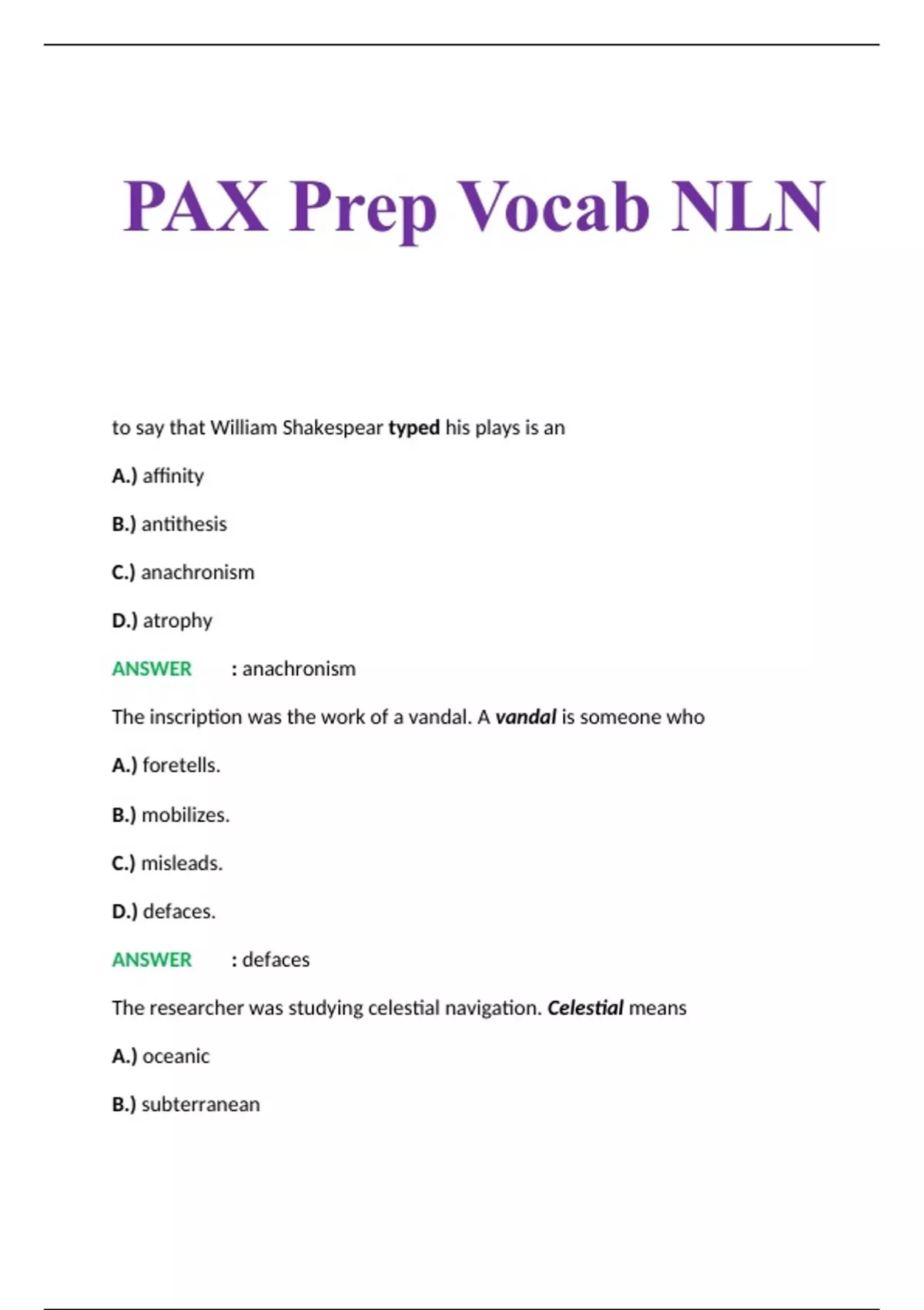 PAX Prep Vocab NLN to say that William Shakespear typed his plays is an A.) affinity B.) antithesis C.) anachronism D.) atrophy ANSWER : anachronism The inscription was the work of a vandal. A vandal is someone who A.) foretells. B.) mobilizes. C.) misleads. D.) defaces. ANSWER : defaces The researcher was studying celestial navigation. Celestial means A.) oceanic B.) subterranean C.) heavenly D.) coastal. ANSWER : heavenly The water permeated the sand in the potted plant. Permeated means A.) dissolved. B.) penetrated. C.) washed away. D.) packed down. ANSWER : penetrated The suspect was apprehended by the crowd. The suspect was A.) seized. B.) engulfed. C.) pursued. D.) attacked. ANSWER : seized Those who will not be present must vote by A.) rote. B.) intonation. C.) orientation. D.) proxy. ANSWER : proxy The police officer had no qualms about taking on the difficult patrol. Qualm means A.) forethought. B.) conscience. C.) delicacy. D.) apprehension. ANSWER : apprehension.