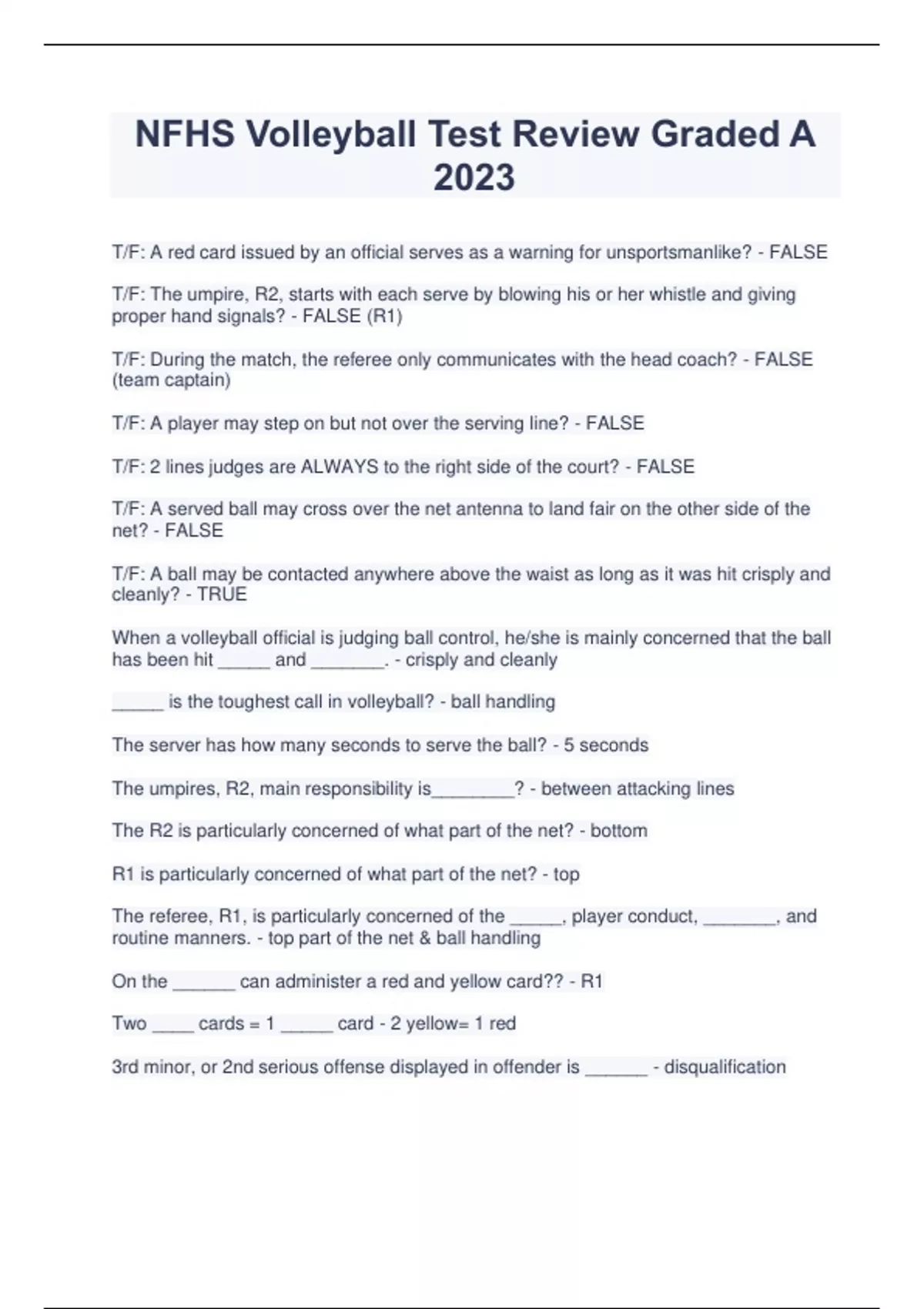 T/F: A red card issued by an official serves as a warning for unsportsmanlike? - FALSE T/F: The umpire, R2, starts with each serve by blowing his or her whistle and giving proper hand signals? - FALSE (R1) T/F: During the match, the referee only communicates with the head coach? - FALSE (team captain) T/F: A player may step on but not over the serving line? - FALSE T/F: 2 lines judges are ALWAYS to the right side of the court? - FALSE T/F: A served ball may cross over the net antenna to land fair on the other side of the net? - FALSE T/F: A ball may be contacted anywhere above the waist as long as it was hit crisply and cleanly? - TRUE When a volleyball official is judging ball control, he/she is mainly concerned that the ball has been hit _____ and _______. - crisply and cleanly _____ is the toughest call in volleyball? - ball handling The server has how many seconds to serve the ball? - 5 seconds The umpires, R2, main responsibility is________? - between attacking lines The R2 is particularly concerned of what part of the net? - bottom R1 is particularly concerned of what part of the net? - top The referee, R1, is particularly concerned of the _____, player conduct, _______, and routine manners. - top part of the net & ball handling On the ______ can administer a red and yellow card?? - R1 Two ____ cards = 1 _____ card - 2 yellow= 1 red 3rd minor, or 2nd serious offense displayed in offender is ______ - disqualification