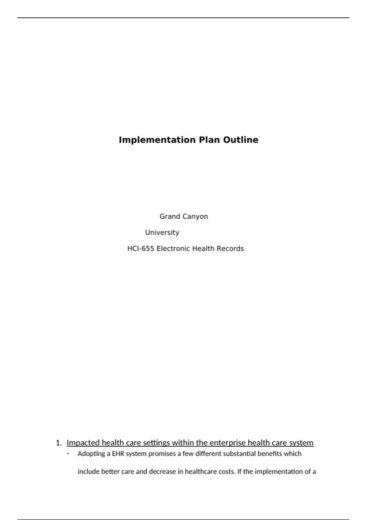 HCI 655 (Electronic Health Records) Topic 8 Assessment: Implementation Plan Outline Description: The purpose of this assignment is to become familiar with the EHR implementation process by creating an implementation plan outline. Develop an implementation plan outline for an enterprise health care system. In your outline, include a description of the following elements and how you would address them in an EHR implementation plan. 1. Impacted health care settings within the enterprise health care system 2. Challenges of implementing EHRs 3. Project management methodology and tools used 4. Health care system organizational structure 5. Needs for interoperability and interfaces between information systems 6. Education and training requirements 7. User acceptance testing considerations