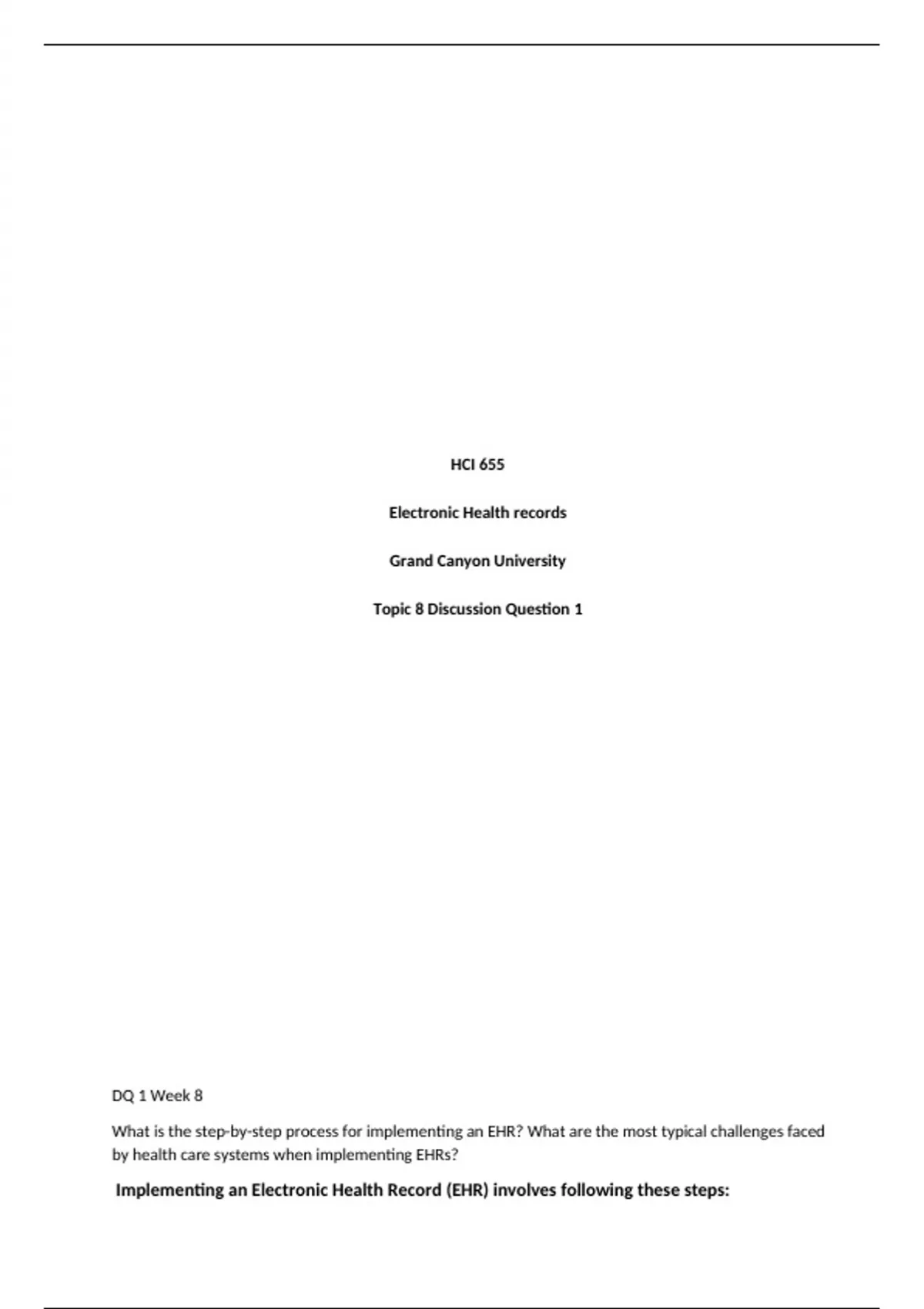 HCI 655 (Electronic Health Records) Topic 8 Discussion Question 1 Description: What is the step-by-step process for implementing an EHR? What are the most typical challenges faced by health care systems when implementing EHRs?