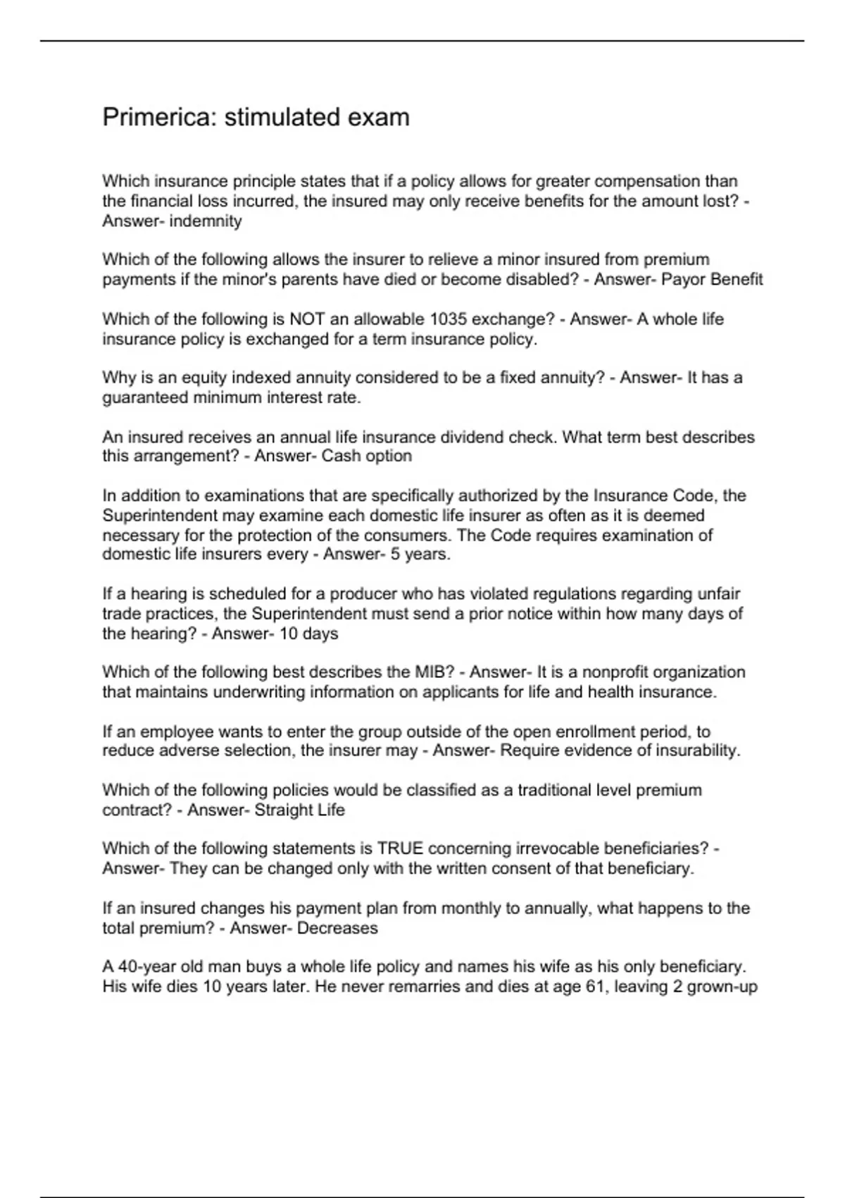 Which insurance principle states that if a policy allows for greater compensation than the financial loss incurred, the insured may only receive benefits for the amount lost? - Answer- indemnity Which of the following allows the insurer to relieve a minor insured from premium payments if the minor's parents have died or become disabled? - Answer- Payor Benefit Which of the following is NOT an allowable 1035 exchange? - Answer- A whole life insurance policy is exchanged for a term insurance policy. Why is an equity indexed annuity considered to be a fixed annuity? - Answer- It has a guaranteed minimum interest rate. An insured receives an annual life insurance dividend check. What term best describes this arrangement? - Answer- Cash option In addition to examinations that are specifically authorized by the Insurance Code, the Superintendent may examine each domestic life insurer as often as it is deemed necessary for the protection of the consumers. The Code requires examination of domestic life insurers every - Answer- 5 years. If a hearing is scheduled for a producer who has violated regulations regarding unfair trade practices, the Superintendent must send a prior notice within how many days of the hear