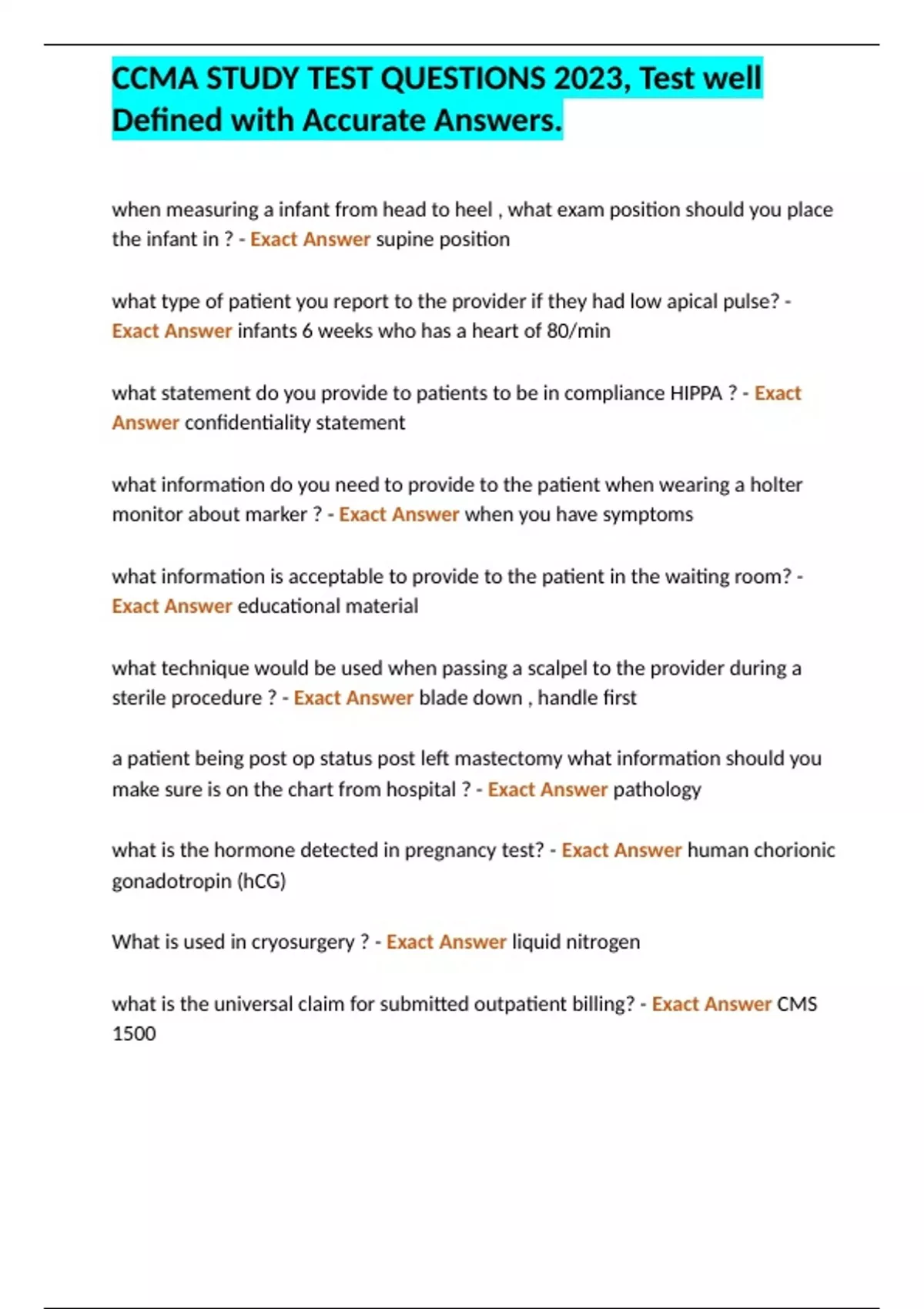 CCMA STUDY TEST QUESTIONS 2023/CCMA REVIEW 2022-/NHA CCMA practice test 2022 & two More Contents