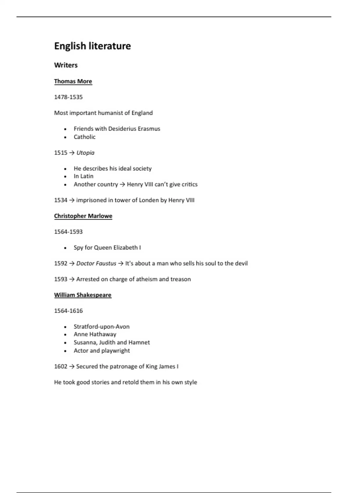 Summary of English Literature 5 VWO. The following topics are included in this summary: writers, Six wives of Henry VIII, The Tudors, The Stuarts, The Renaissance, Terms.