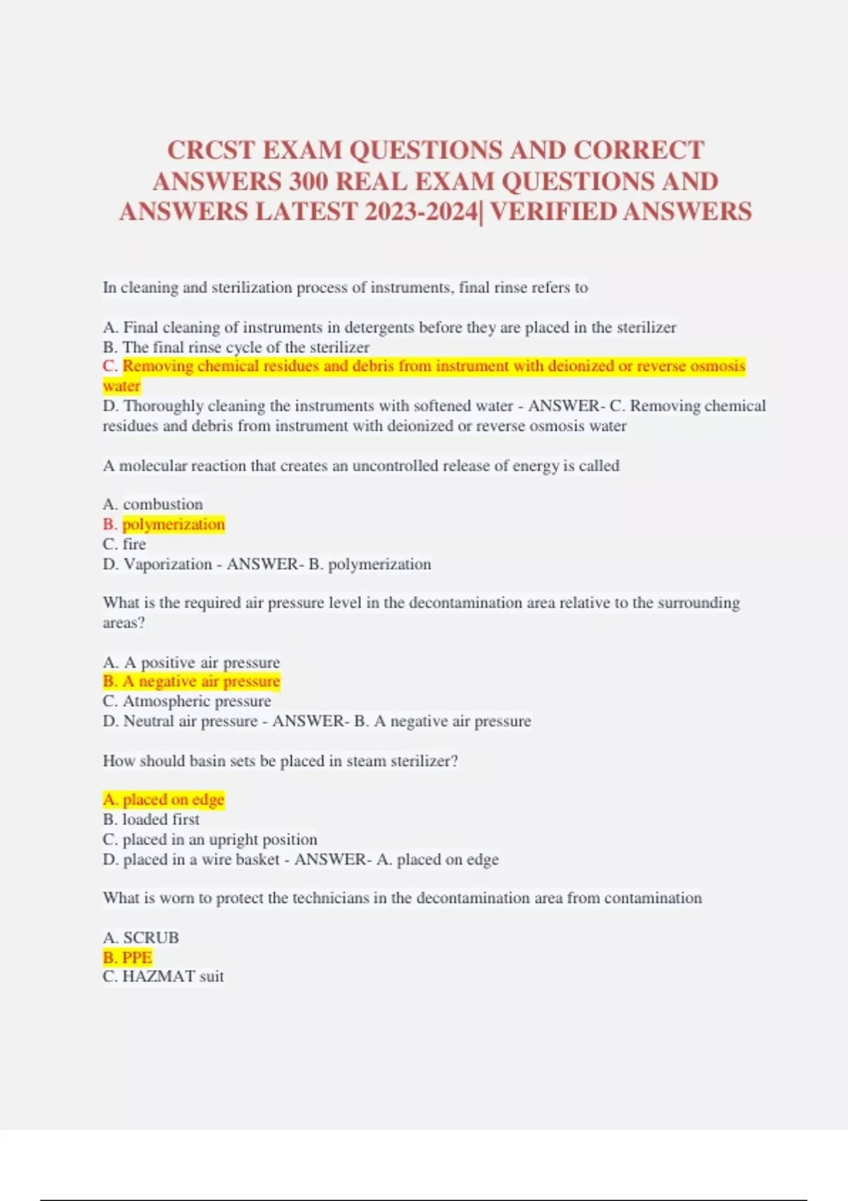 CRCST EXAM QUESTIONS AND CORRECT ANSWERS 300 REAL EXAM QUESTIONS AND ANSWERS LATEST | VERIFIED ANSWERS