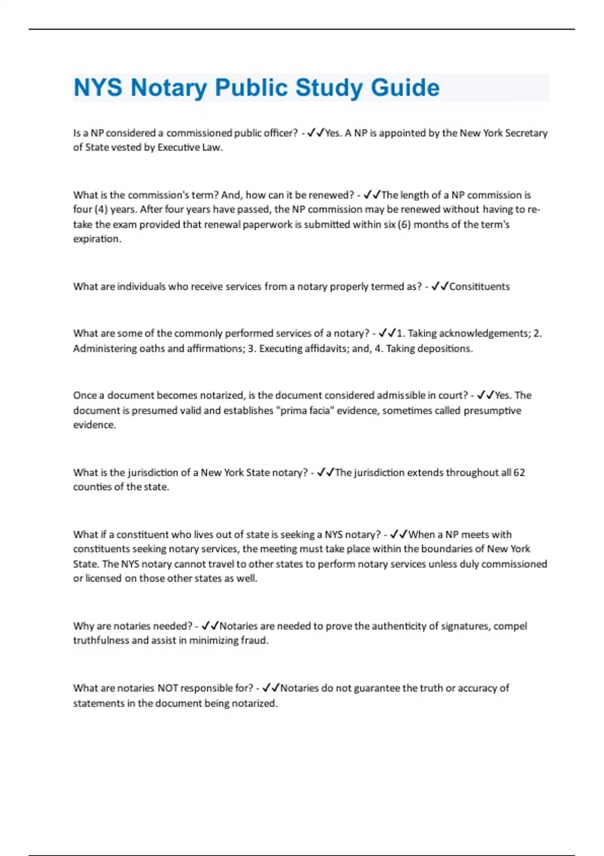 s a NP considered a commissioned public officer? - Yes. A NP is appointed by the New York Secretary of State vested by Executive Law. What is the commission's term? And, how can it be renewed? - The length of a NP commission is four (4) years. After four years have passed, the NP commission may be renewed without having to retake the exam provided that renewal paperwork is submitted within six (6) months of the term's expiration. What are individuals who receive services from a notary properly termed as? - Consitituents What are some of the commonly performed services of a notary? - 1. Taking acknowledgements; 2. Administering oaths and affirmations; 3. Executing affidavits; and, 4. Taking depositions. Once a document becomes notarized, is the document considered admissible in court? - Yes. The document is presumed valid and establishes "prima facia" evidence, sometimes called presumptive evidence. What is the jurisdiction of a New York State notary? - The jurisdiction extends throughout all 62 counties of the state. What if a constituent who lives out of state is seeking a NYS notary? - When a NP meets with constituents seeking notary services, the meeting must take place within the boundaries of New York State. The NYS notary cannot travel to other states to perform notary services unless duly commissioned or licensed on those other states as well. Why are notaries needed? - Notaries are needed to prove the authenticity of signatures, compel truthfulness and assist in minimizing fraud. What are notaries NOT responsible for? - Notaries do not guarantee the truth or accuracy of statements in the document being notarized.