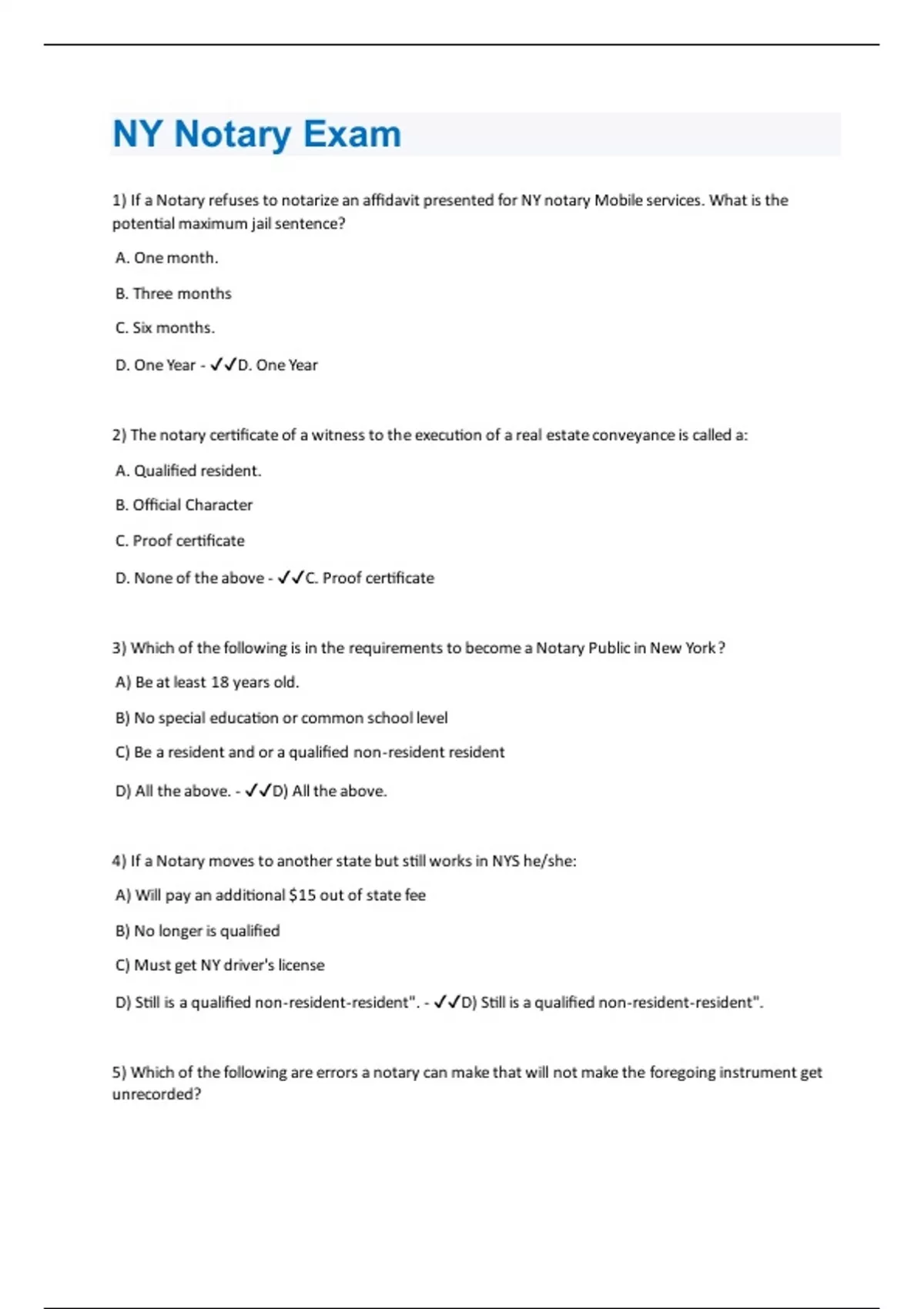 ) If a Notary refuses to notarize an affidavit presented for NY notary Mobile services. What is the potential maximum jail sentence? A. One month. B. Three months C. Six months. D. One Year - D. One Year 2) The notary certificate of a witness to the execution of a real estate conveyance is called a: A. Qualified resident. B. Official Character C. Proof certificate D. None of the above - C. Proof certificate 3) Which of the following is in the requirements to become a Notary Public in New York? A) Be at least 18 years old. B) No special education or common school level C) Be a resident and or a qualified non-resident resident D) All the above. - D) All the above. 4) If a Notary moves to another state but still works in NYS he/she: A) Will pay an additional $15 out of state fee B) No longer is qualified C) Must get NY driver's license D) Still is a qualified non-resident-resident". - D) Still is a qualified non-resident-resident". 5) Which of the following are errors a notary can make that will not make the foregoing instrument get unrecorded?A) If the Notary Public was purporting to be a notary but was not licensed. B) If the Notary Public commission was expired. C) If a New York Notary notarizes in another state. D) All the above. - D) All the above.