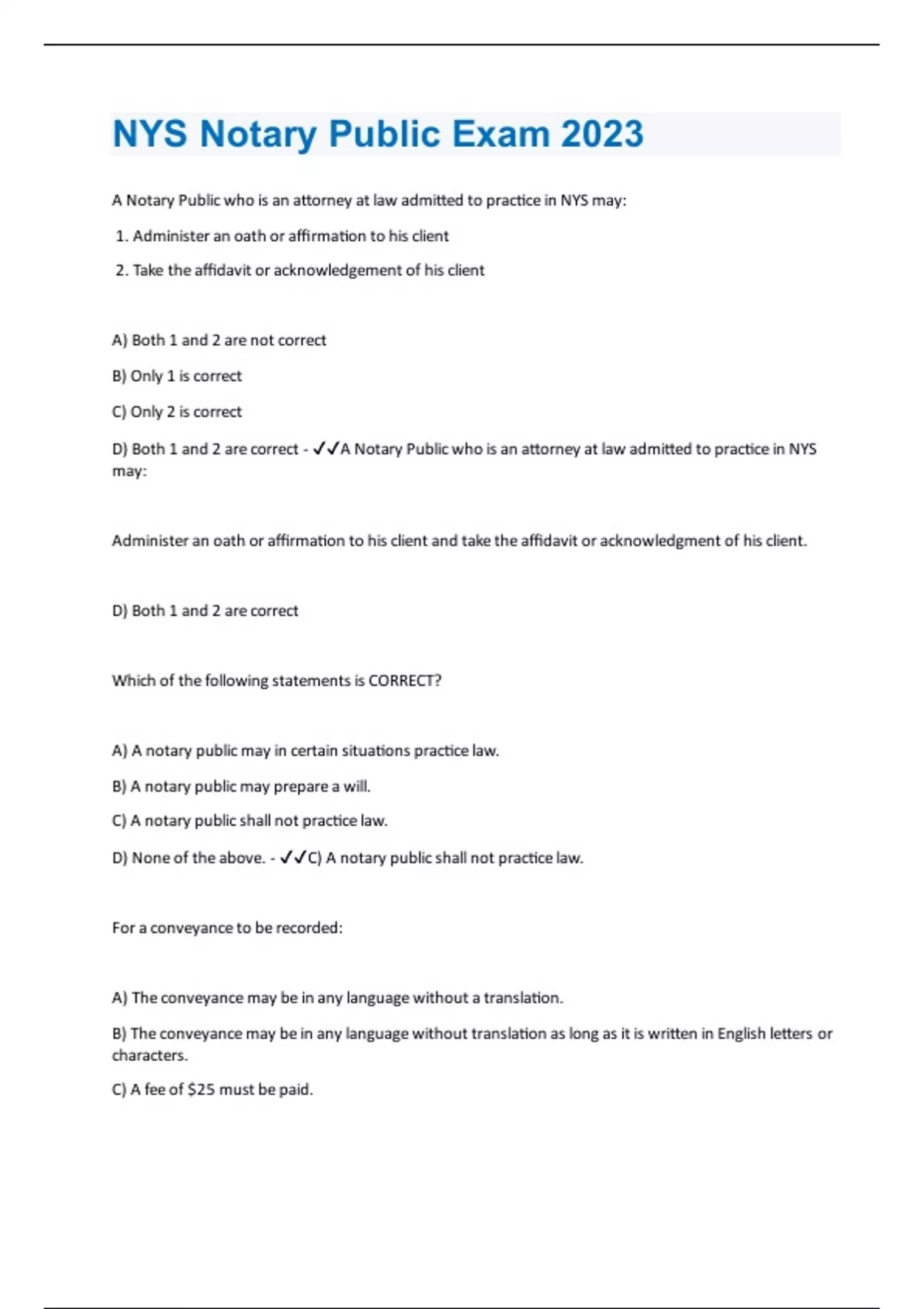 A Notary Public who is an attorney at law admitted to practice in NYS may: 1. Administer an oath or affirmation to his client 2. Take the affidavit or acknowledgement of his client A) Both 1 and 2 are not correct B) Only 1 is correct C) Only 2 is correct D) Both 1 and 2 are correct - A Notary Public who is an attorney at law admitted to practice in NYS may: Administer an oath or affirmation to his client and take the affidavit or acknowledgment of his client. D) Both 1 and 2 are correct Which of the following statements is CORRECT? A) A notary public may in certain situations practice law. B) A notary public may prepare a will. C) A notary public shall not practice law. D) None of the above. - C) A notary public shall not practice law. For a conveyance to be recorded: A) The conveyance may be in any language without a translation. B) The conveyance may be in any language without translation as long as it is written in English letters or characters. C) A fee of $25 must be paid.D) None of the above. - D) None of the above. A Notary Public who knowingly issues a false certificate is guilty of: A) An "A" Misdemeanor B) A "B" Misdemeanor C) A "D" Felony D) An "E" Felony - A Notary Public who knowingly issues a false certificate is guilty of: D) An "E" Felony