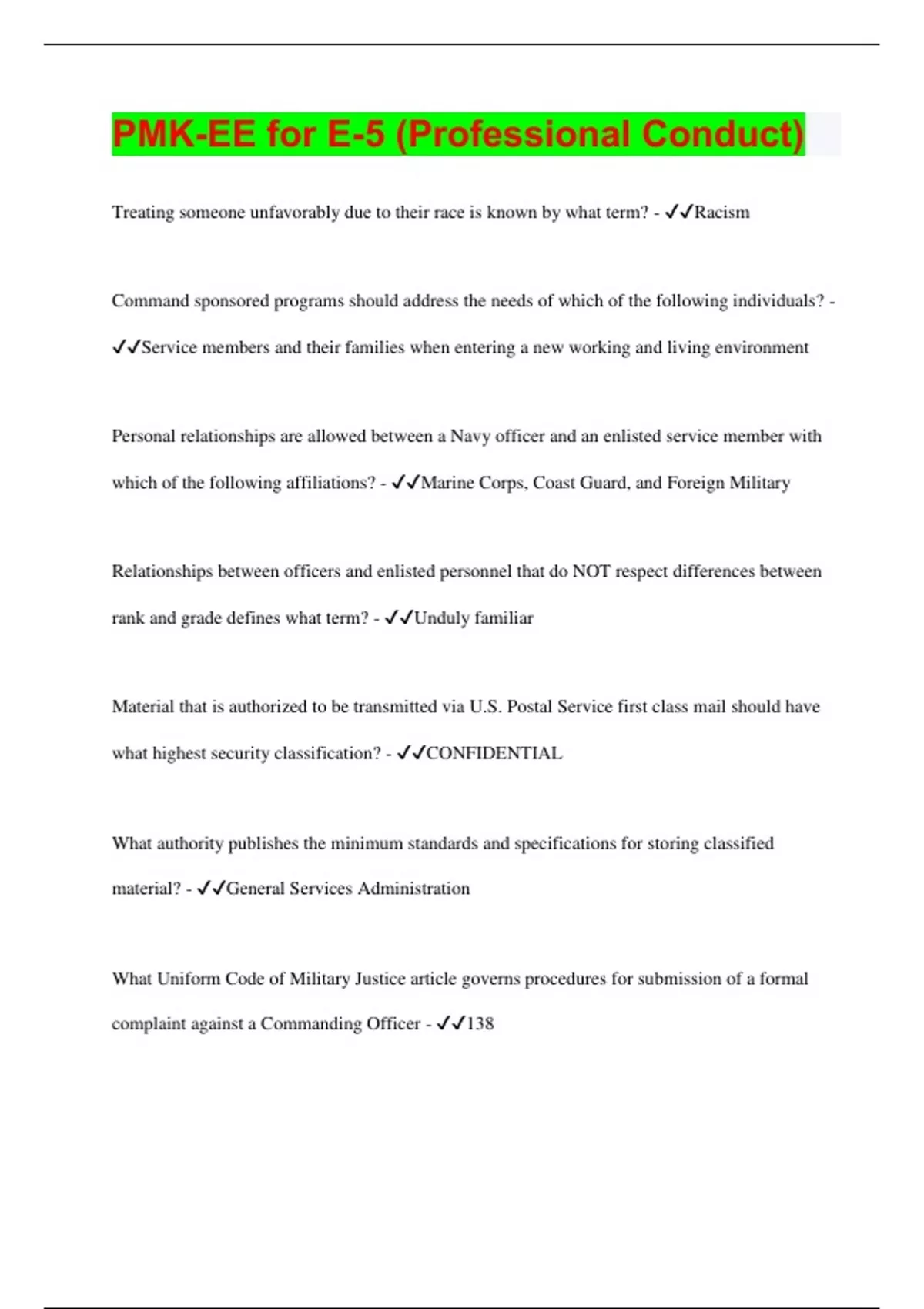 PMK-EE for E-5 (Professional Conduct) | 100 Questions with 100% Correct Answers | Updated & Verified