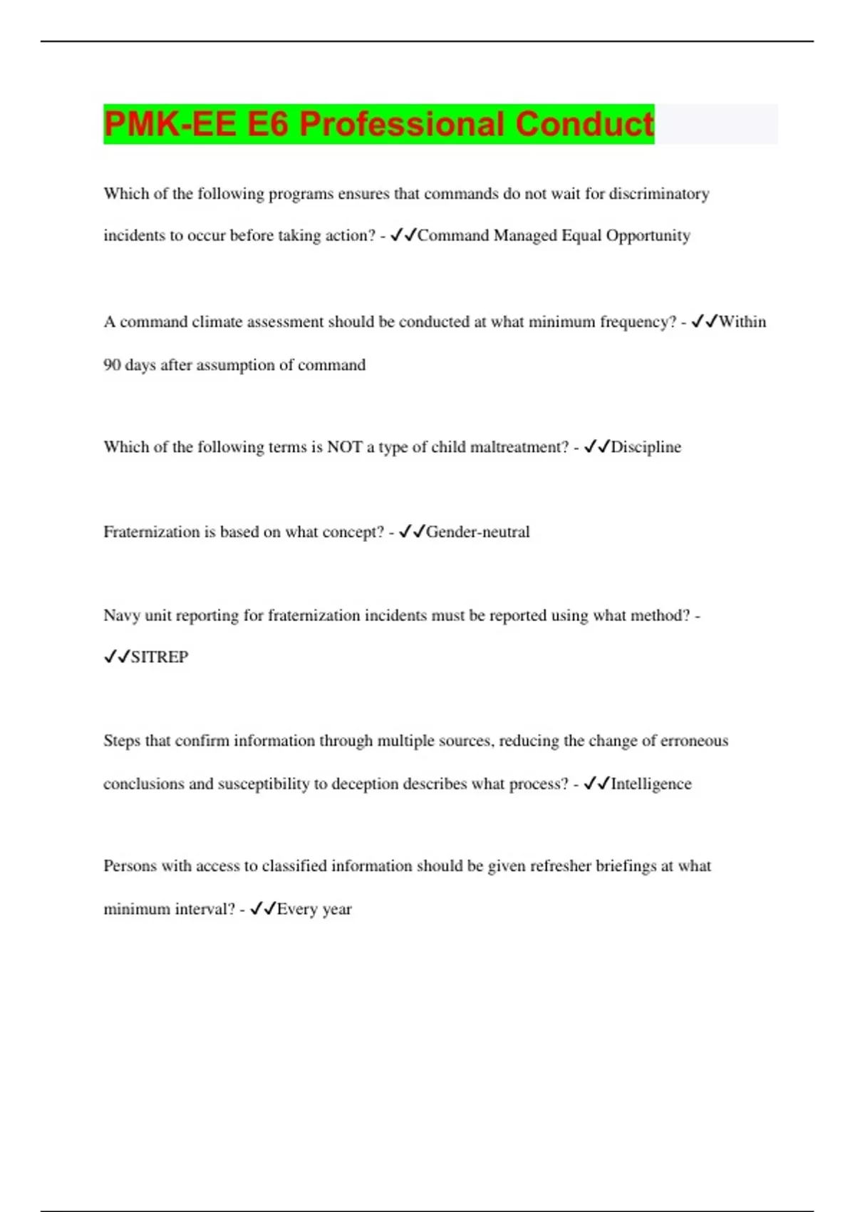 Which of the following programs ensures that commands do not wait for discriminatory incidents to occur before taking action? - Command Managed Equal Opportunity A command climate assessment should be conducted at what minimum frequency? - Within 90 days after assumption of command Which of the following terms is NOT a type of child maltreatment? - Discipline Fraternization is based on what concept? - Gender-neutral Navy unit reporting for fraternization incidents must be reported using what method? - SITREP Steps that confirm information through multiple sources, reducing the change of erroneous conclusions and susceptibility to deception describes what process? - Intelligence Persons with access to classified information should be given refresher briefings at what minimum interval? - Every year