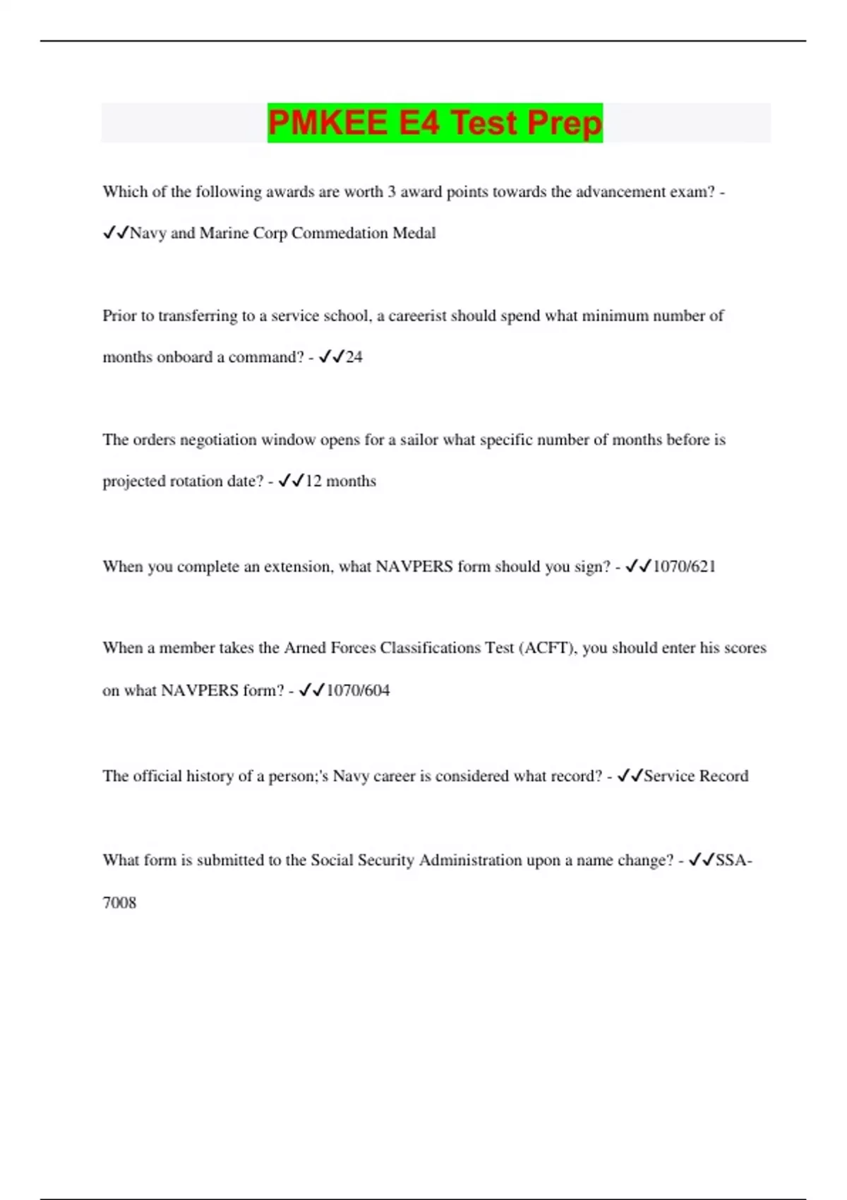 Which of the following awards are worth 3 award points towards the advancement exam? - Navy and Marine Corp Commedation Medal Prior to transferring to a service school, a careerist should spend what minimum number of months onboard a command? - 24 The orders negotiation window opens for a sailor what specific number of months before is projected rotation date? - 12 months When you complete an extension, what NAVPERS form should you sign? - 1070/621 When a member takes the Arned Forces Classifications Test (ACFT), you should enter his scores on what NAVPERS form? - 1070/604 The official history of a person;'s Navy career is considered what record? - Service Record What form is submitted to the Social Security Administration upon a name change? - SSA- 7008