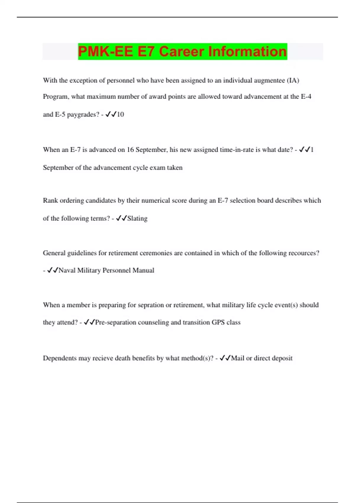 With the exception of personnel who have been assigned to an individual augmentee (IA) Program, what maximum number of award points are allowed toward advancement at the E-4 and E-5 paygrades? - 10 When an E-7 is advanced on 16 September, his new assigned time-in-rate is what date? - 1 September of the advancement cycle exam taken Rank ordering candidates by their numerical score during an E-7 selection board describes which of the following terms? - Slating General guidelines for retirement ceremonies are contained in which of the following recources? - Naval Military Personnel Manual When a member is preparing for sepration or retirement, what military life cycle event(s) should they attend? - Pre-separation counseling and transition GPS class Dependents may recieve death benefits by what method(s)? - Mail or direct deposit
