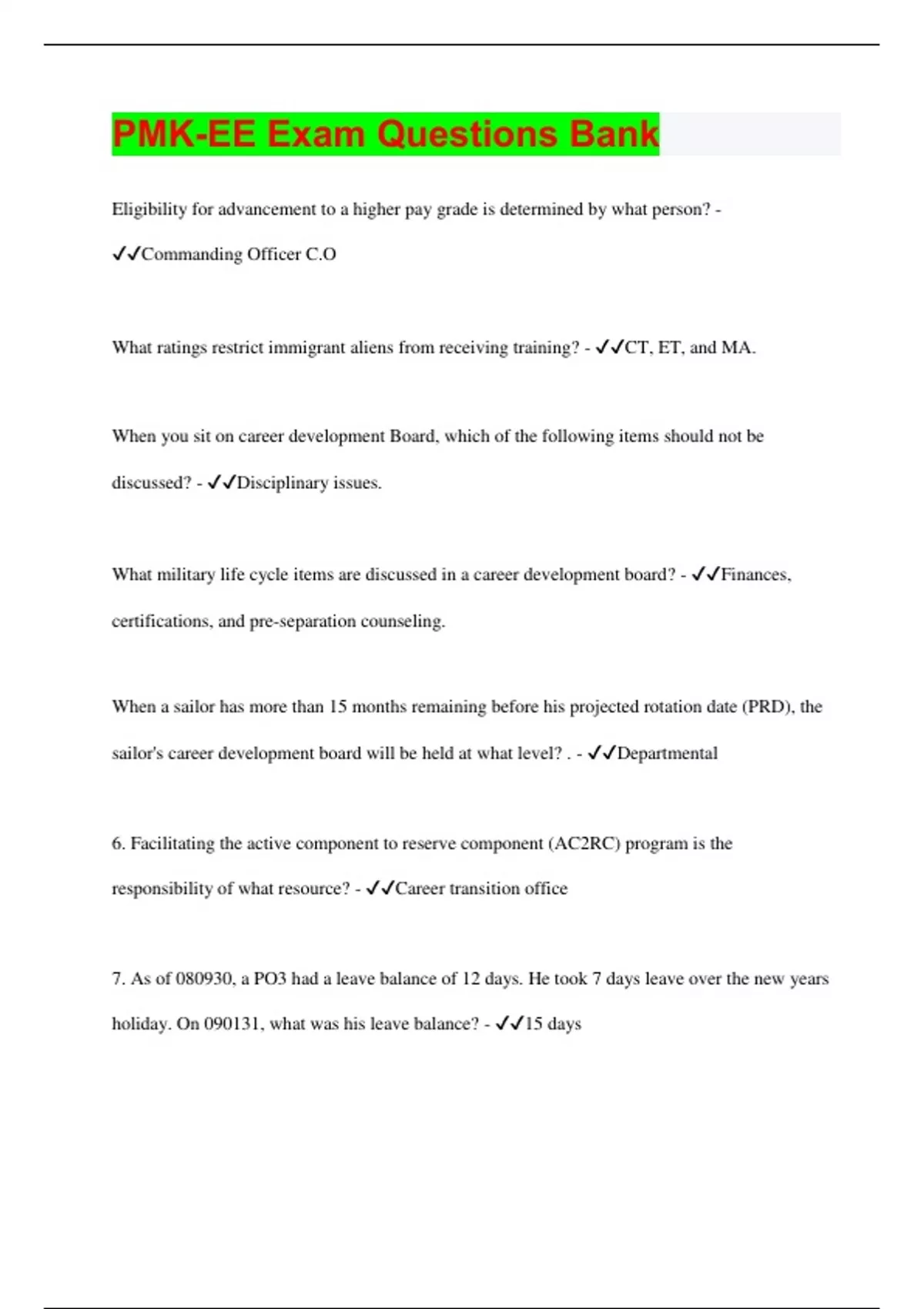 Eligibility for advancement to a higher pay grade is determined by what person? - Commanding Officer C.O What ratings restrict immigrant aliens from receiving training? - CT, ET, and MA. When you sit on career development Board, which of the following items should not be discussed? - Disciplinary issues. What military life cycle items are discussed in a career development board? - Finances, certifications, and pre-separation counseling. When a sailor has more than 15 months remaining before his projected rotation date (PRD), the sailor's career development board will be held at what level? . - Departmental 6. Facilitating the active component to reserve component (AC2RC) program is the responsibility of what resource? - Career transition office 7. As of , a PO3 had a leave balance of 12 days. He took 7 days leave over the new years holiday. On , what was his leave balance? - 15 days