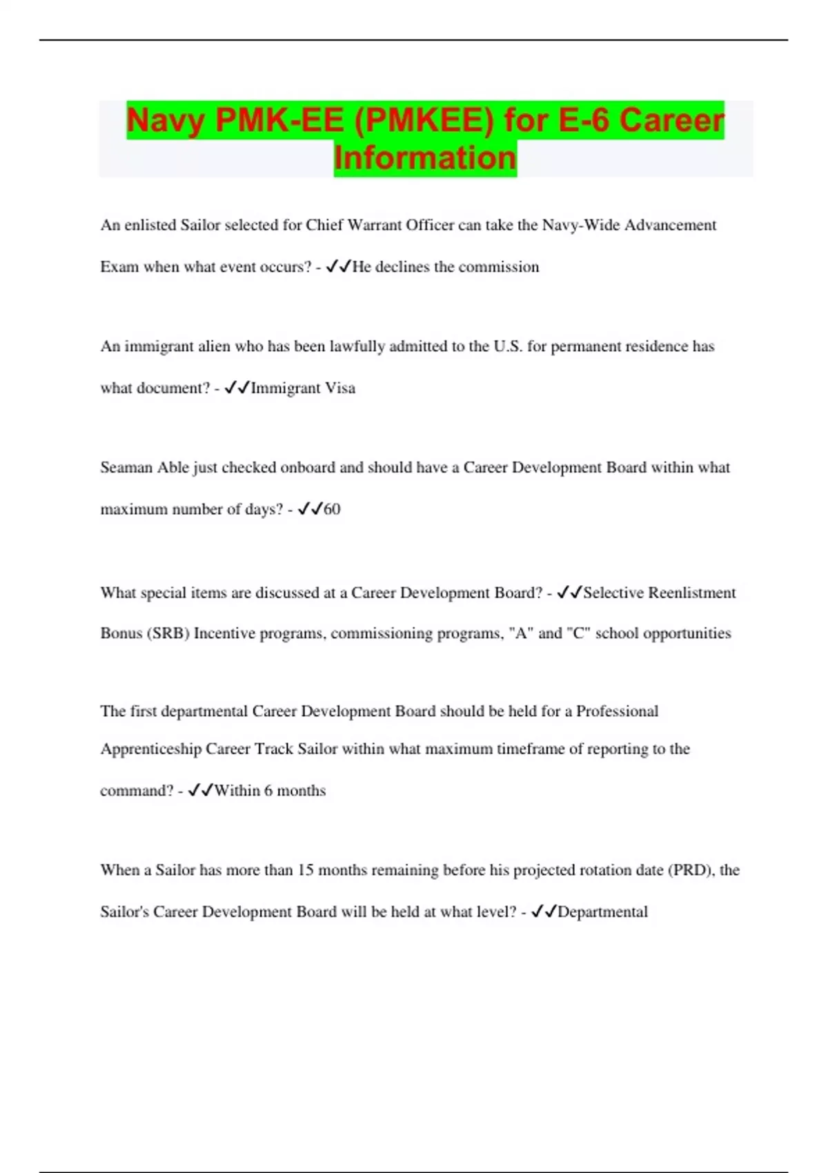 An enlisted Sailor selected for Chief Warrant Officer can take the Navy-Wide Advancement Exam when what event occurs? - He declines the commission An immigrant alien who has been lawfully admitted to the U.S. for permanent residence has what document? - Immigrant Visa Seaman Able just checked onboard and should have a Career Development Board within what maximum number of days? - 60 What special items are discussed at a Career Development Board? - Selective Reenlistment Bonus (SRB) Incentive programs, commissioning programs, "A" and "C" school opportunities The first departmental Career Development Board should be held for a Professional Apprenticeship Career Track Sailor within what maximum timeframe of reporting to the command? - Within 6 months When a Sailor has more than 15 months remaining before his projected rotation date (PRD), the Sailor's Career Development Board will be held at what level? - Departmental