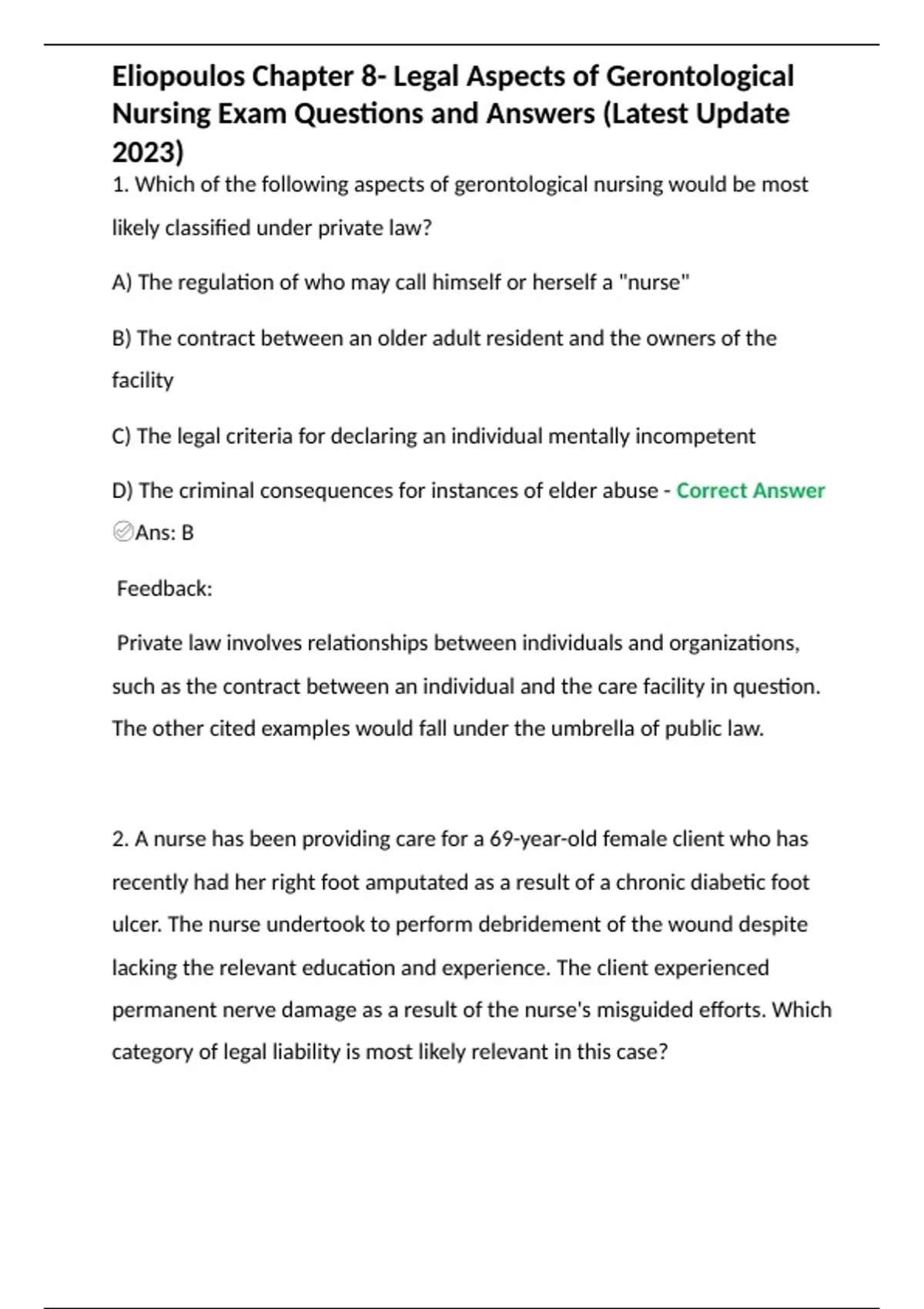 Eliopoulos Chapter 8- Legal Aspects of Gerontological Nursing Exam Questions and Answers (Latest Update 2023)