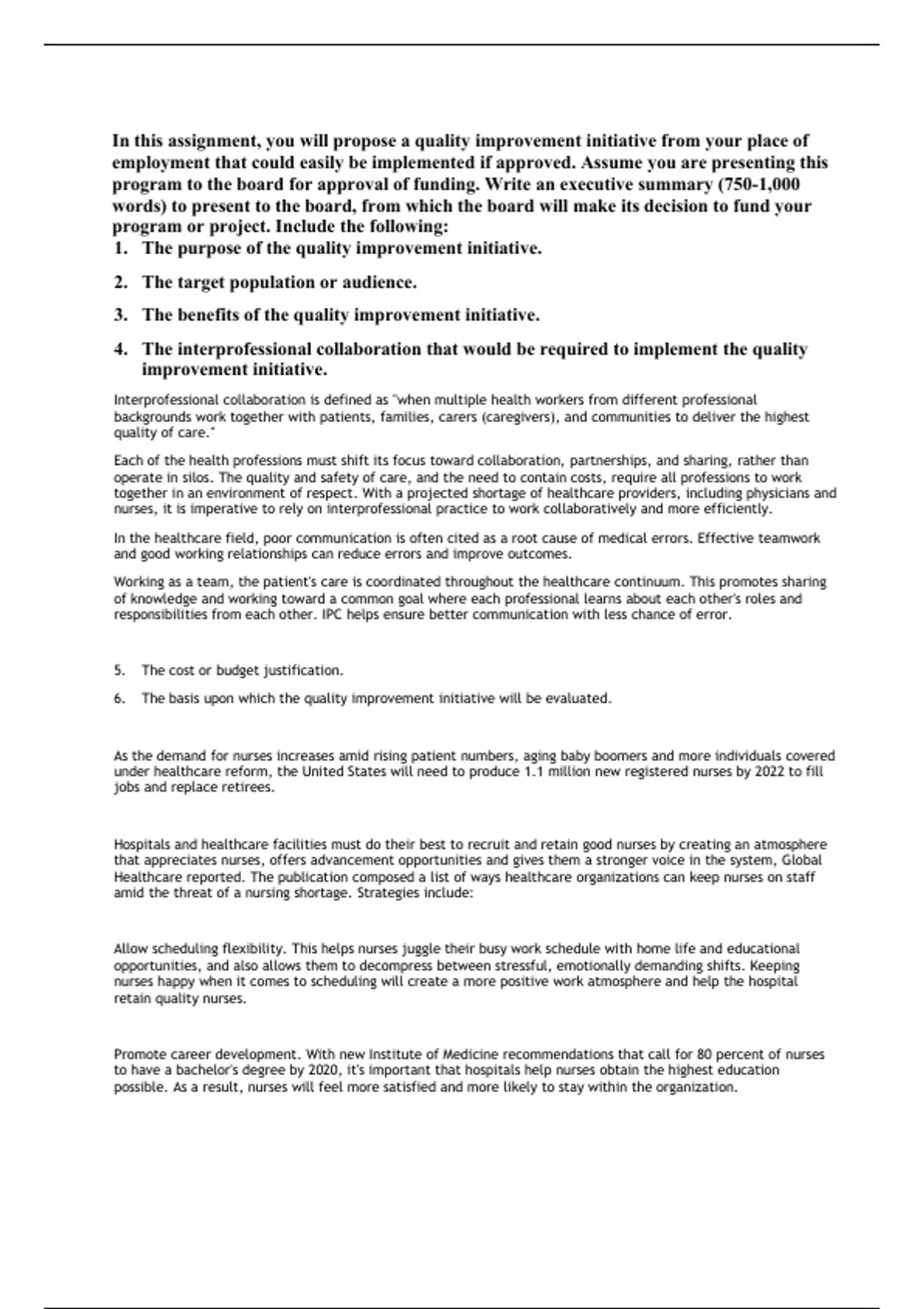 In this assignment, you will propose a quality improvement initiative from your place of employment that could easily be implemented if approved. Assume you are presenting this program to the board for approval of funding. Write an executive summary (750-1,000 words) to present to the board, from which the board will make its decision to fund your program or project. Include the following: 1. The purpose of the quality improvement initiative. 2. The target population or audience. 3. The benefits of the quality improvement initiative. 4. The interprofessional collaboration that would be required to implement the quality improvement initiative.