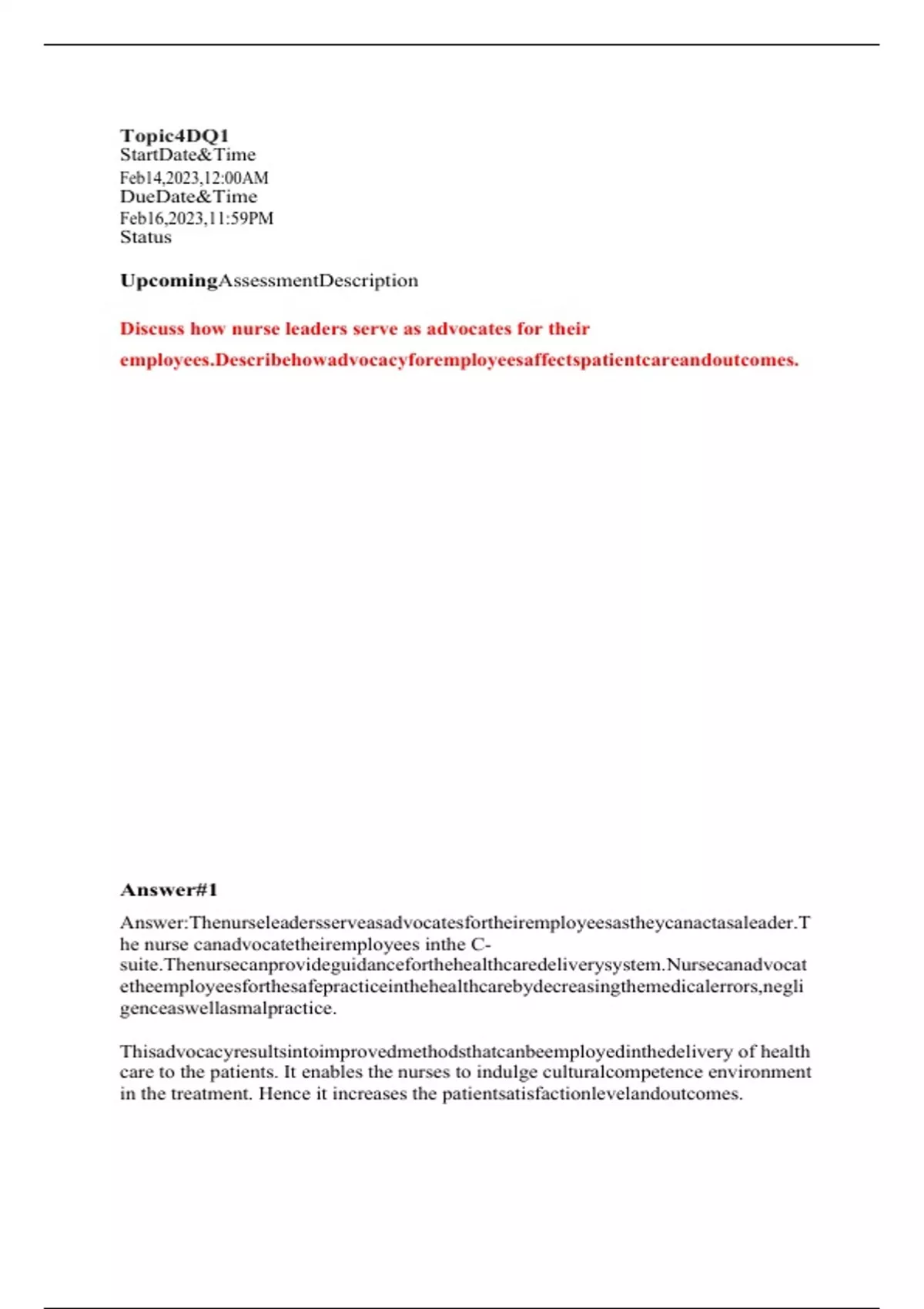 UpcomingAssessmentDescription Discuss how nurse leaders serve as advocates for their employees.Describehowadvocacyforemployeesaffectspatientcareandoutcomes.