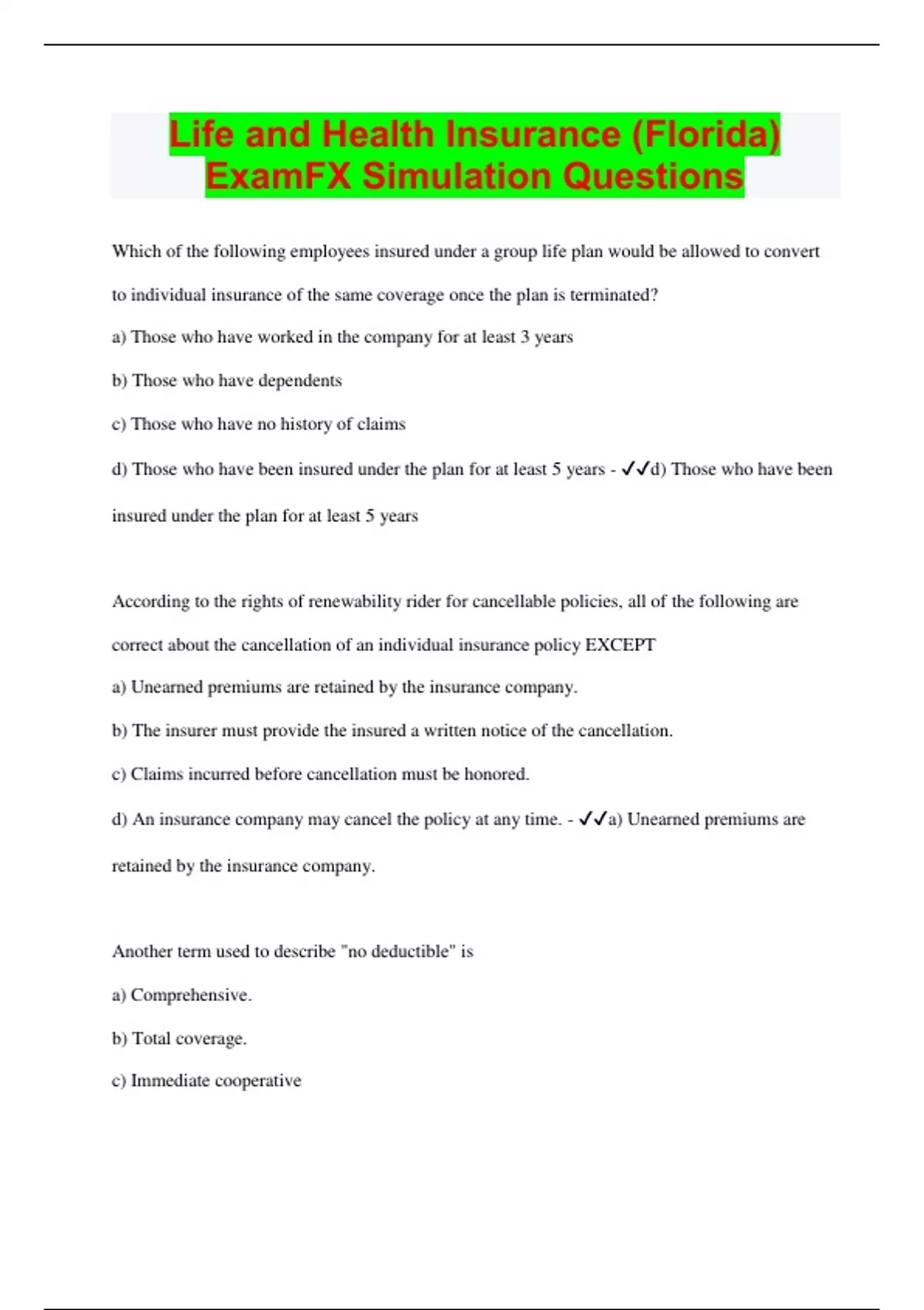 Which of the following employees insured under a group life plan would be allowed to convert to individual insurance of the same coverage once the plan is terminated? a) Those who have worked in the company for at least 3 years b) Those who have dependents c) Those who have no history of claims d) Those who have been insured under the plan for at least 5 years - d) Those who have been insured under the plan for at least 5 years According to the rights of renewability rider for cancellable policies, all of the following are correct about the cancellation of an individual insurance policy EXCEPT a) Unearned premiums are retained by the insurance company. b) The insurer must provide the insured a written notice of the cancellation. c) Claims incurred before cancellation must be honored. d) An insurance company may cancel the policy at any time. - a) Unearned premiums are retained by the insurance company. Another term used to describe "no deductible" is a) Comprehensive. b) Total coverage. c) Immediate cooperative