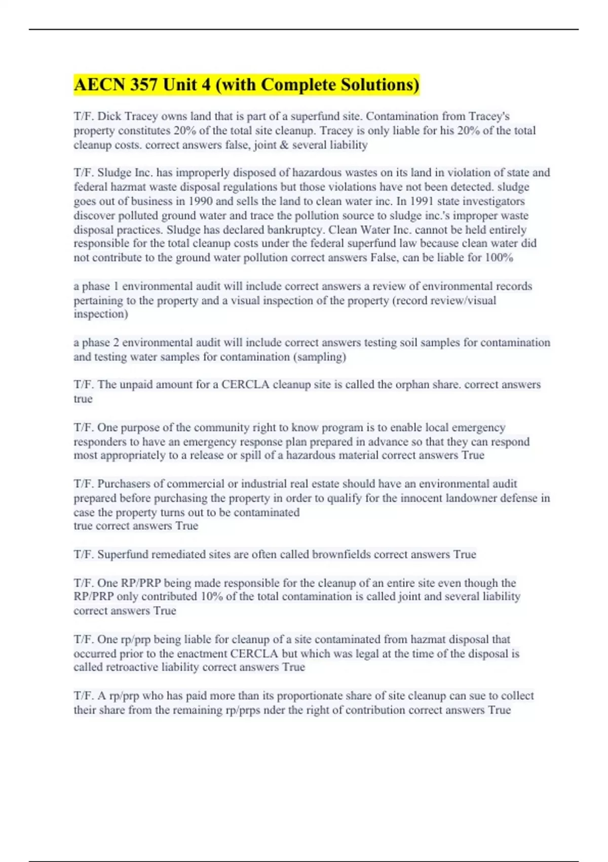 T/F. Dick Tracey owns land that is part of a superfund site. Contamination from Tracey's property constitutes 20% of the total site cleanup. Tracey is only liable for his 20% of the total cleanup costs. correct answers false, joint & several liability T/F. Sludge Inc. has improperly disposed of hazardous wastes on its land in violation of state and federal hazmat waste disposal regulations but those violations have not been detected. sludge goes out of business in 1990 and sells the land to clean water inc. In 1991 state investigators discover polluted ground water and trace the pollution source to sludge inc.'s improper waste disposal practices. Sludge has declared bankruptcy. Clean Water Inc. cannot be held entirely responsible for the total cleanup costs under the federal superfund law because clean water did not contribute to the ground water pollution correct answers False, can be liable for 100% a phase 1 environmental audit will include correct answers a review of environmental records pertaining to the property and a visual inspection of the property (record review/visual inspection) a phase 2 environmental audit will include correct answers testing soil samples for contamination and testing water samples for contamination (sampling) T/F. The unpaid amount for a CERCLA cleanup site is called the orphan share. correct answers true T/F. One purpose of the community right to know program is to enable local emergency responders to have an emergency response plan prepared in advance so that they can respond most appropriately to a release or spill of a hazardous material correct answers True T/F. Purchasers of commercial or industrial real estate should have an environmental audit prepared before purchasing the property in order to qualify for the innocent landowner defense in case the property turns out to be contaminated true correct answers True T/F. Superfund remediated sites are often called brownfields correct answers True T/F. One RP/PRP being made responsible for the cleanup of an entire site even though the RP/PRP only contributed 10% of the total contamination is called joint and several liability correct answers True T/F. One rp/prp being liable for cleanup of a site contaminated from hazmat disposal that occurred prior to the enactment CERCLA but which was legal at the time of the disposal is called retroactive liability correct answers True T/F. A rp/prp who has paid more than its proportionate share of site cleanup can sue to collect their share from the remaining rp/prps nder the right of contribution correct answers True