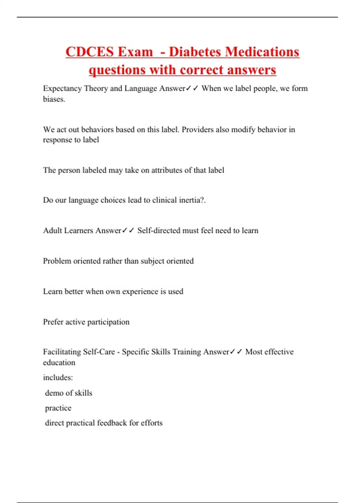 Expectancy Theory and Language Answer When we label people, we form biases. We act out behaviors based on this label. Providers also modify behavior in response to label The person labeled may take on attributes of that label Do our language choices lead to clinical inertia?. Adult Learners Answer Self-directed must feel need to learn Problem oriented rather than subject oriented Learn better when own experience is used Prefer active participation Facilitating Self-Care - Specific Skills Training Answer Most effective education includes: demo of skills practice