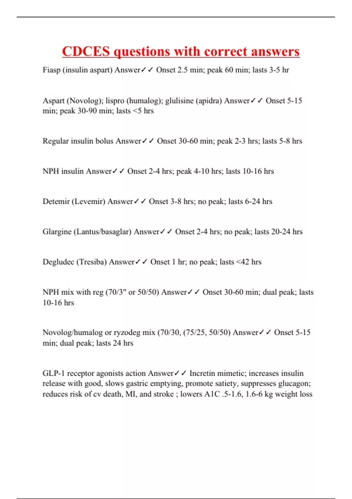 Fiasp (insulin aspart) Answer Onset 2.5 min; peak 60 min; lasts 3-5 hr Aspart (Novolog); lispro (humalog); glulisine (apidra) Answer Onset 5-15 min; peak 30-90 min; lasts <5 hrs Regular insulin bolus Answer Onset 30-60 min; peak 2-3 hrs; lasts 5-8 hrs NPH insulin Answer Onset 2-4 hrs; peak 4-10 hrs; lasts 10-16 hrs Detemir (Levemir) Answer Onset 3-8 hrs; no peak; lasts 6-24 hrs Glargine (Lantus/basaglar) Answer Onset 2-4 hrs; no peak; lasts 20-24 hrs Degludec (Tresiba) Answer Onset 1 hr; no peak; lasts <42 hrs NPH mix with reg (70/3" or 50/50) Answer Onset 30-60 min; dual peak; lasts 10-16 hrs Novolog/humalog or ryzodeg mix (70/30, (75/25, 50/50) Answer Onset 5-15 min; dual peak; lasts 24 hrs GLP-1 receptor agonists action Answer Incretin mimetic; increases insulin release with good, slows gastric emptying, promote satiety, suppresses glucagon; reduces risk of cv death, MI, and stroke ; lowers A1C