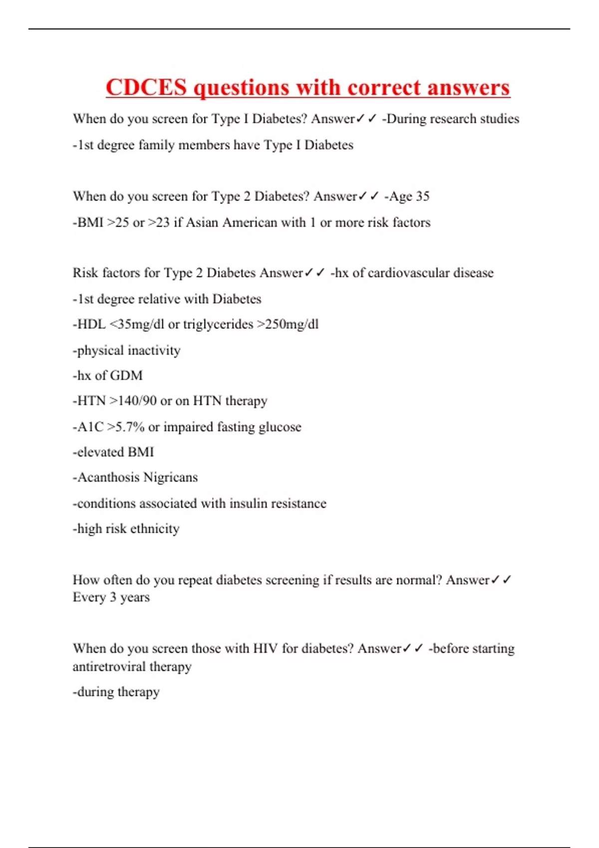 When do you screen for Type I Diabetes? Answer -During research studies -1st degree family members have Type I Diabetes When do you screen for Type 2 Diabetes? Answer -Age 35 -BMI >25 or >23 if Asian American with 1 or more risk factors Risk factors for Type 2 Diabetes Answer -hx of cardiovascular disease -1st degree relative with Diabetes -HDL <35mg/dl or triglycerides >250mg/dl -physical inactivity -hx of GDM -HTN >140/90 or on HTN therapy -A1C >5.7% or impaired fasting glucose -elevated BMI -Acanthosis Nigricans -conditions associated with insulin resistance -high risk ethnicity