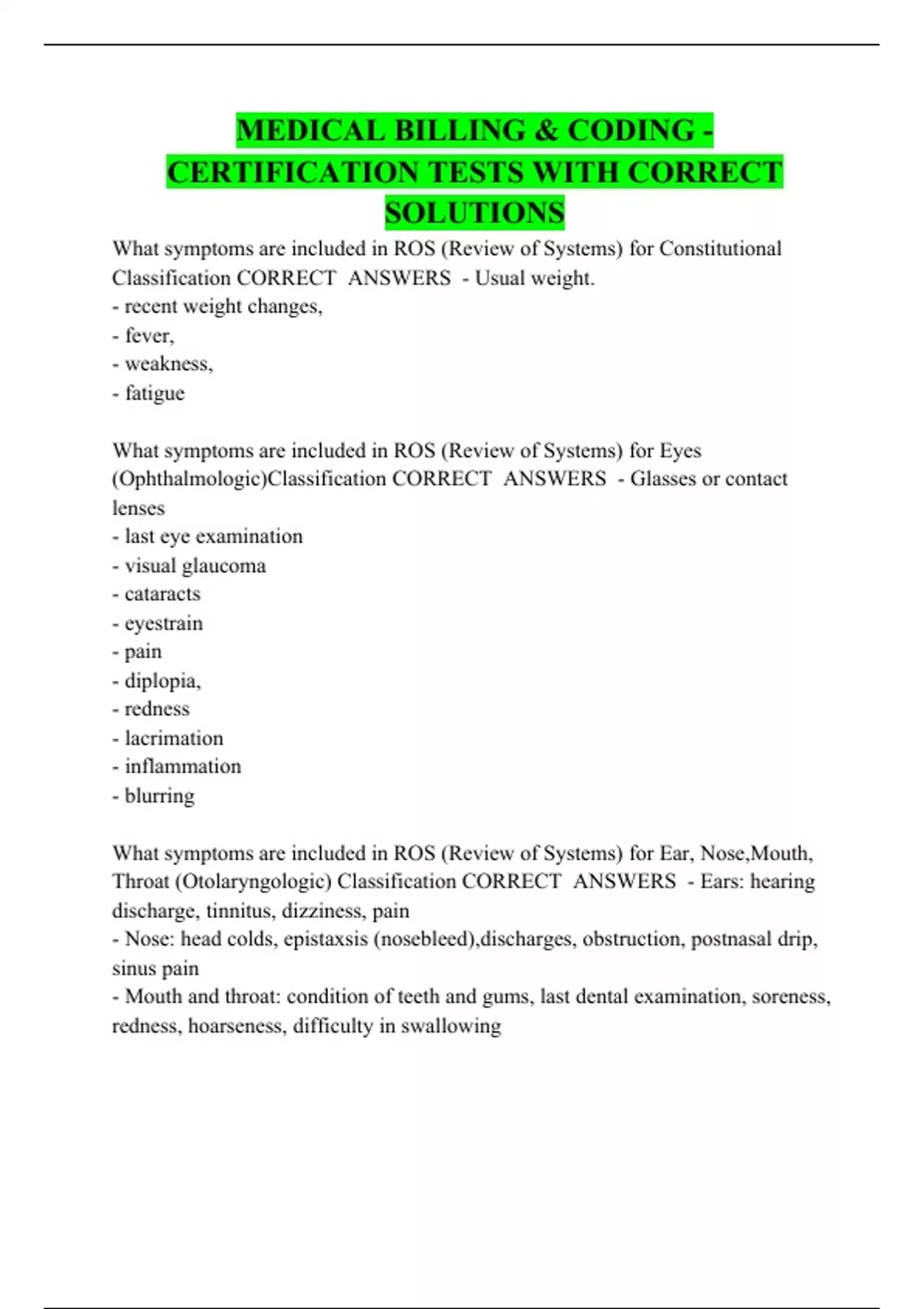 MEDICAL BILLING & CODING - CERTIFICATION TESTS WITH CORRECT SOLUTIONS What symptoms are included in ROS (Review of Systems) for Constitutional Classification What symptoms are included in ROS (Review of Systems) for Eyes (Ophthalmologic)Classification What symptoms are included in ROS (Review of Systems) for Ear, Nose,Mouth, Throat (Otolaryngologic) Classification What symptoms are included in ROS (review of Systems) for Cardiovascular Classification What symptoms are included in ROS for Respiratory Classification What symptoms are included in ROS for Gastrointestinal Classification Genitourinary What symptoms are included in ROS for Urinary Classification What symptoms are included in ROS for Genitoreproductive Classification What symptoms are included in ROS for Musculoskeletal Classification What symptoms are included in ROS for Integumentary Classification (skin or breast) What symptoms are included in ROS for Neurologic (Neurological) Classification What symptoms are included in ROS for Psychiatric Classification What symptoms are included in ROS for Endocrine Classification What sympotoms are included in ROS for Hematologic.Lymphatic Classification What symptoms are included in ROS for Allergic/Immunologic Classification