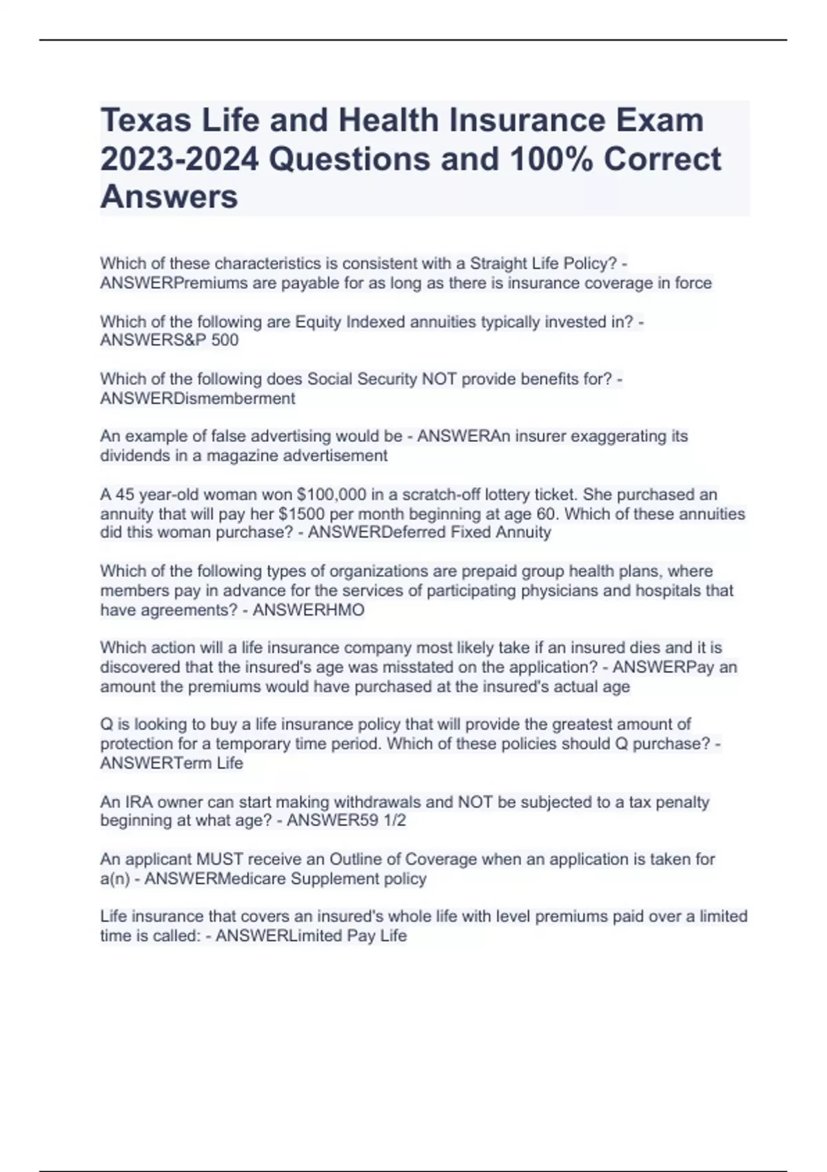 Texas Life and Health Insurance Exam Questions and 100% Correct AnswersTexas Life and Health Insurance Exam Questions and 100% Correct AnswersTexas Life and Health Insurance Exam Questions and 100% Correct AnswersTexas Life and Health Insurance Exam Questions and 100% Correct AnswersWhich of these characteristics is consistent with a Straight Life Policy? - ANSWERPremiums are payable for as long as there is insurance coverage in force Which of the following are Equity Indexed annuities typically invested in? - ANSWERS&P 500 Which of the following does Social Security NOT provide benefits for? - ANSWERDismemberment An example of false advertising would be - ANSWERAn insurer exaggerating its dividends in a magazine advertisement A 45 year-old woman won $100,000 in a scratch-off lottery ticket. She purchased an annuity that will pay her $1500 per month beginning at age 60. Which of these annuities did this woman purchase? - ANSWERDeferred Fixed Annuity Which of the following types of organizations are prepaid group health plans, where members pay in advance for the services of participating physicians and hospitals that have agreements? - ANSWERHMO Which action will a life insurance company most likely take if an insured dies and it is