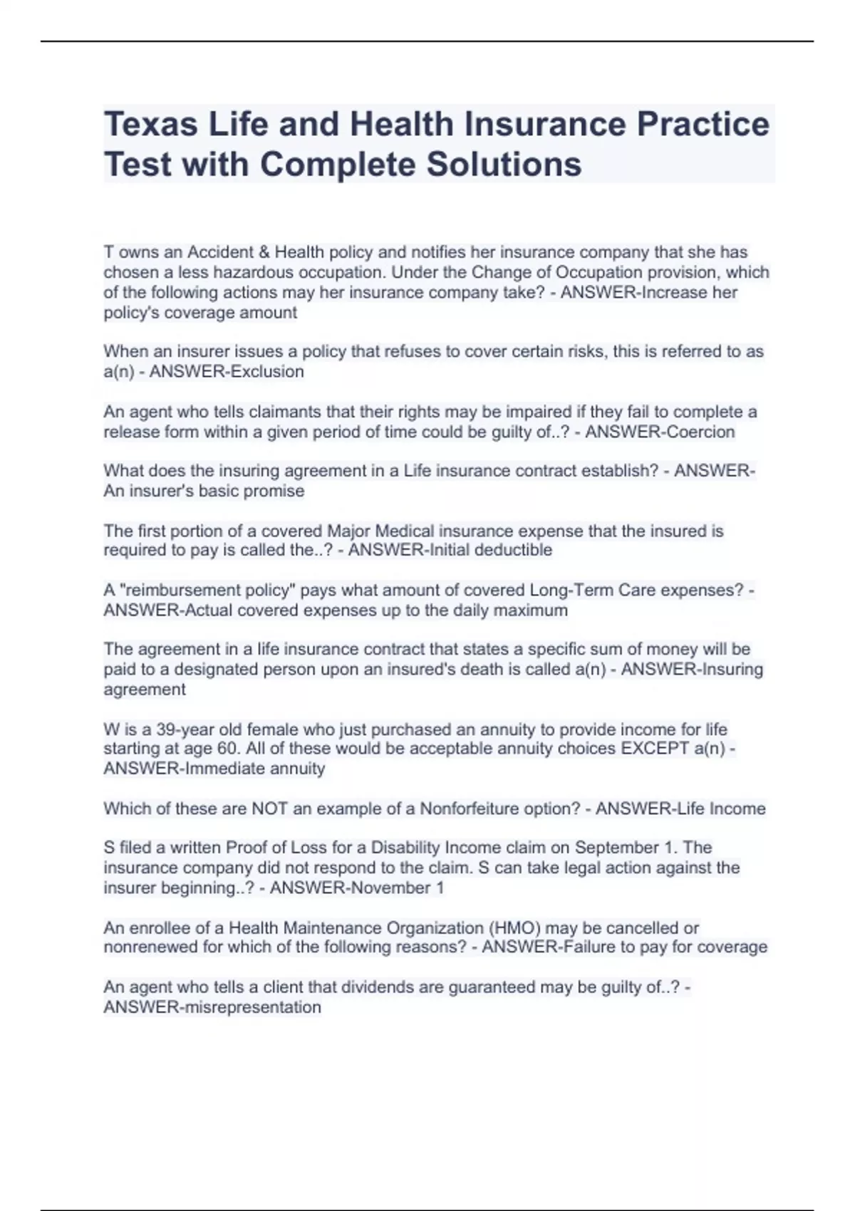 Texas Life and Health Insurance Practice Test with Complete Solutions Texas Life and Health Insurance Practice Test with Complete Solutions Texas Life and Health Insurance Practice Test with Complete Solutions Texas Life and Health Insurance Practice Test with Complete Solutions T owns an Accident & Health policy and notifies her insurance company that she has chosen a less hazardous occupation. Under the Change of Occupation provision, which of the following actions may her insurance company take? - ANSWER-Increase her policy's coverage amount When an insurer issues a policy that refuses to cover certain risks, this is referred to as a(n) - ANSWER-Exclusion An agent who tells claimants that their rights may be impaired if they fail to complete a release form within a given period of time could be guilty of..? - ANSWER-Coercion What does the insuring agreement in a Life insurance contract establish? - ANSWER-An insurer's basic promise The first portion of a covered Major Medical insurance expense that the insured is required to pay is called the..? - ANSWER-Initial deductible A "reimbursement policy" pays what amount of covered Long-Term Care expenses? - ANSWER-Actual covered expenses up to the daily maximum The agreement in a life insurance contract that states a specific sum of money will be paid to a designated person upon an insured's death is called a(n) - ANSWER-Insuring agreement W is a 39-year old female who just purchased an annuity to provide income for life starting at age 60. All of these would be acceptable annuity choices EXCEPT a(n) - ANSWER-Immediate annuity Which of these are NOT an example of a Nonforfeiture option? - ANSWER-Life Income S filed a written Proof of Loss for a Disability Income claim on September 1. The insurance company did not respond to the claim. S can take legal action against the